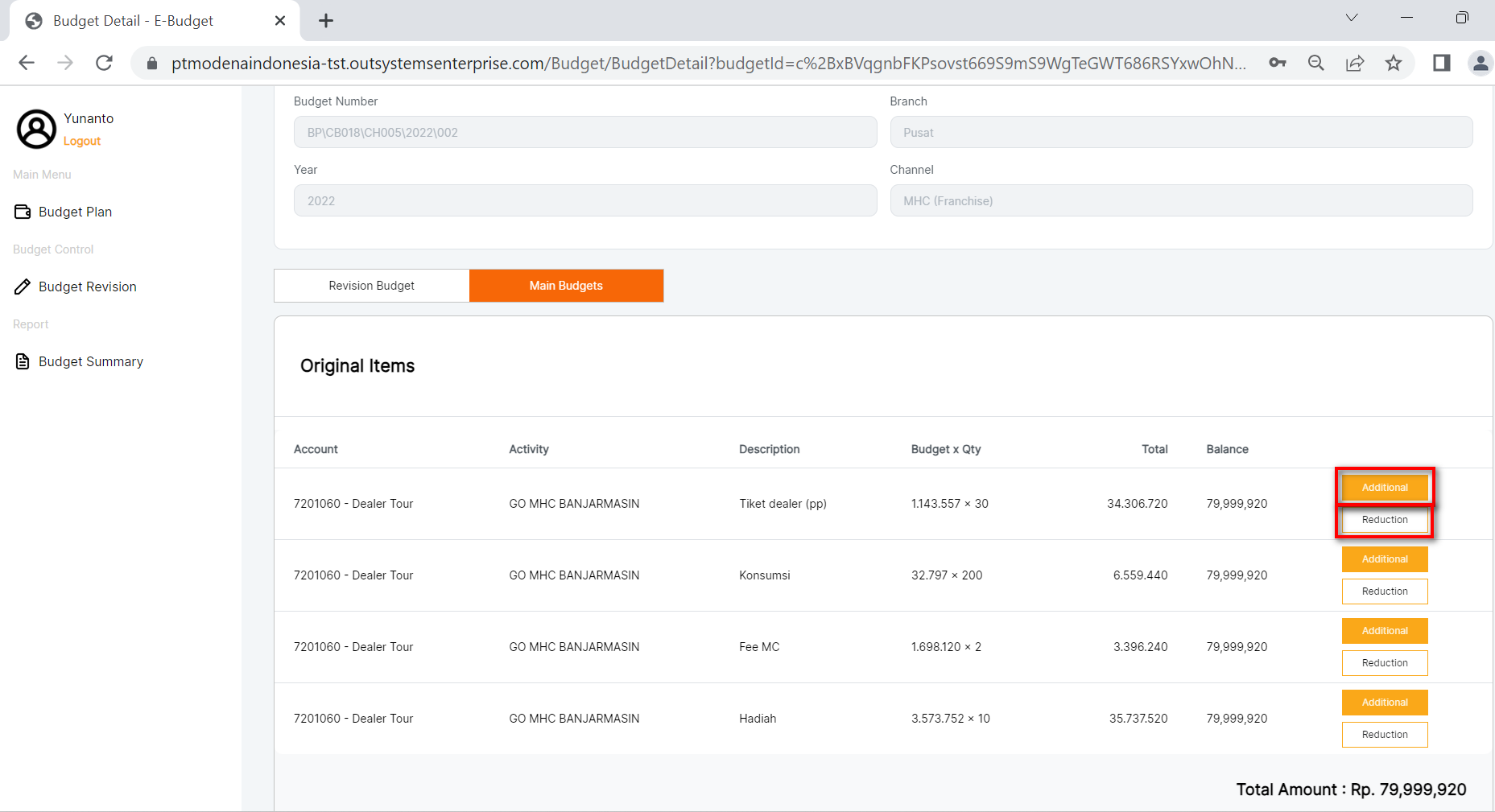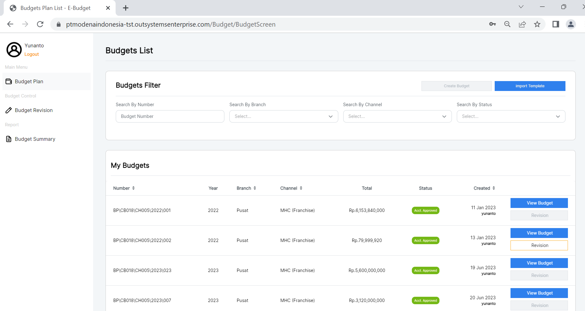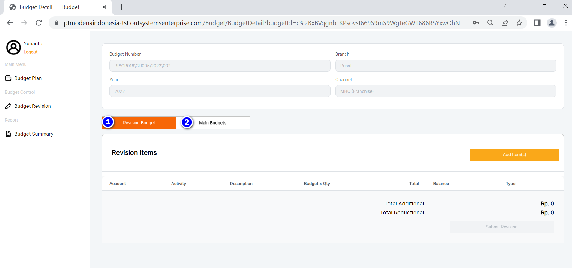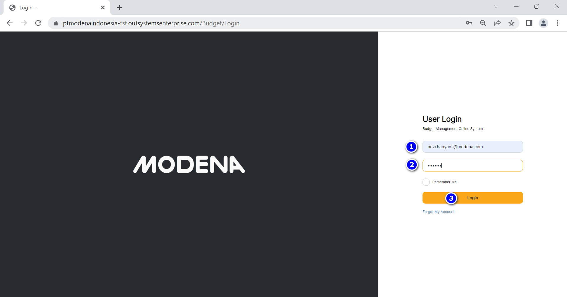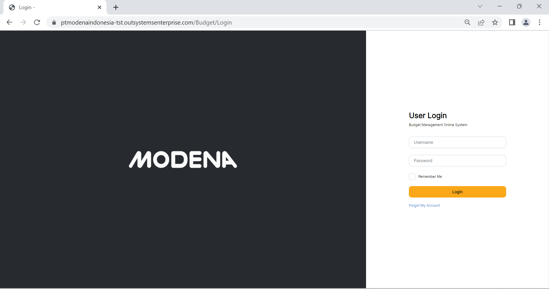 - Masuk ke URL https://ptmodenaindonesia-tst.outsystemsenterprise.com/Budget/Login