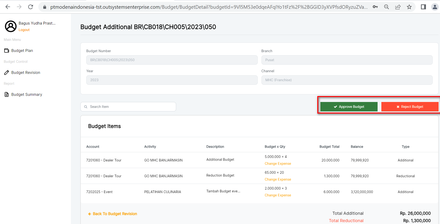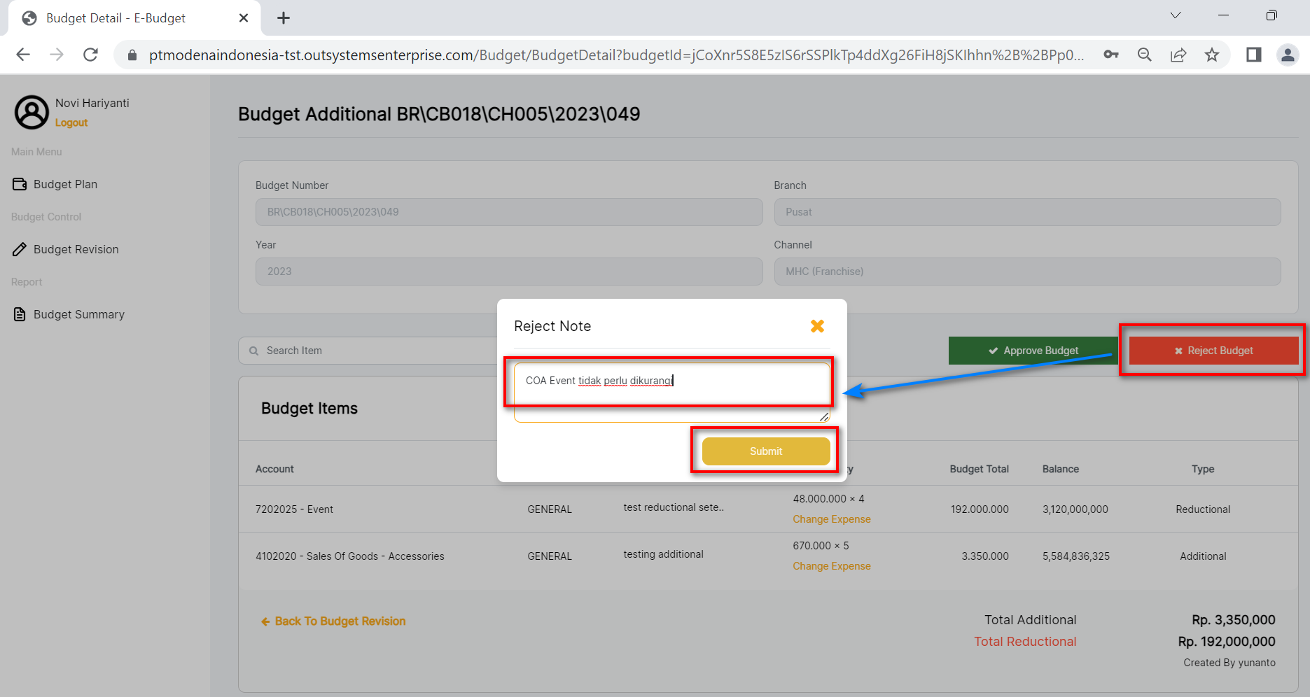 - Apabila ingin melakukan reject approval, dapat dilakukan dengan klik Reject Budget.
