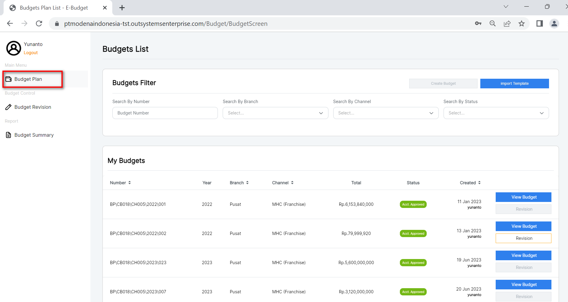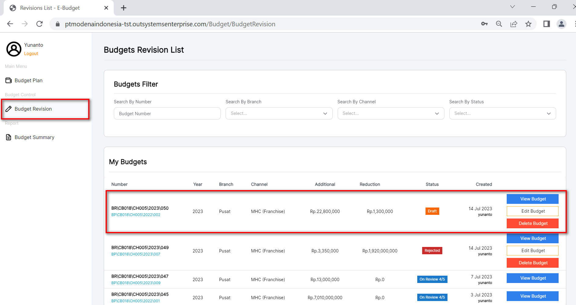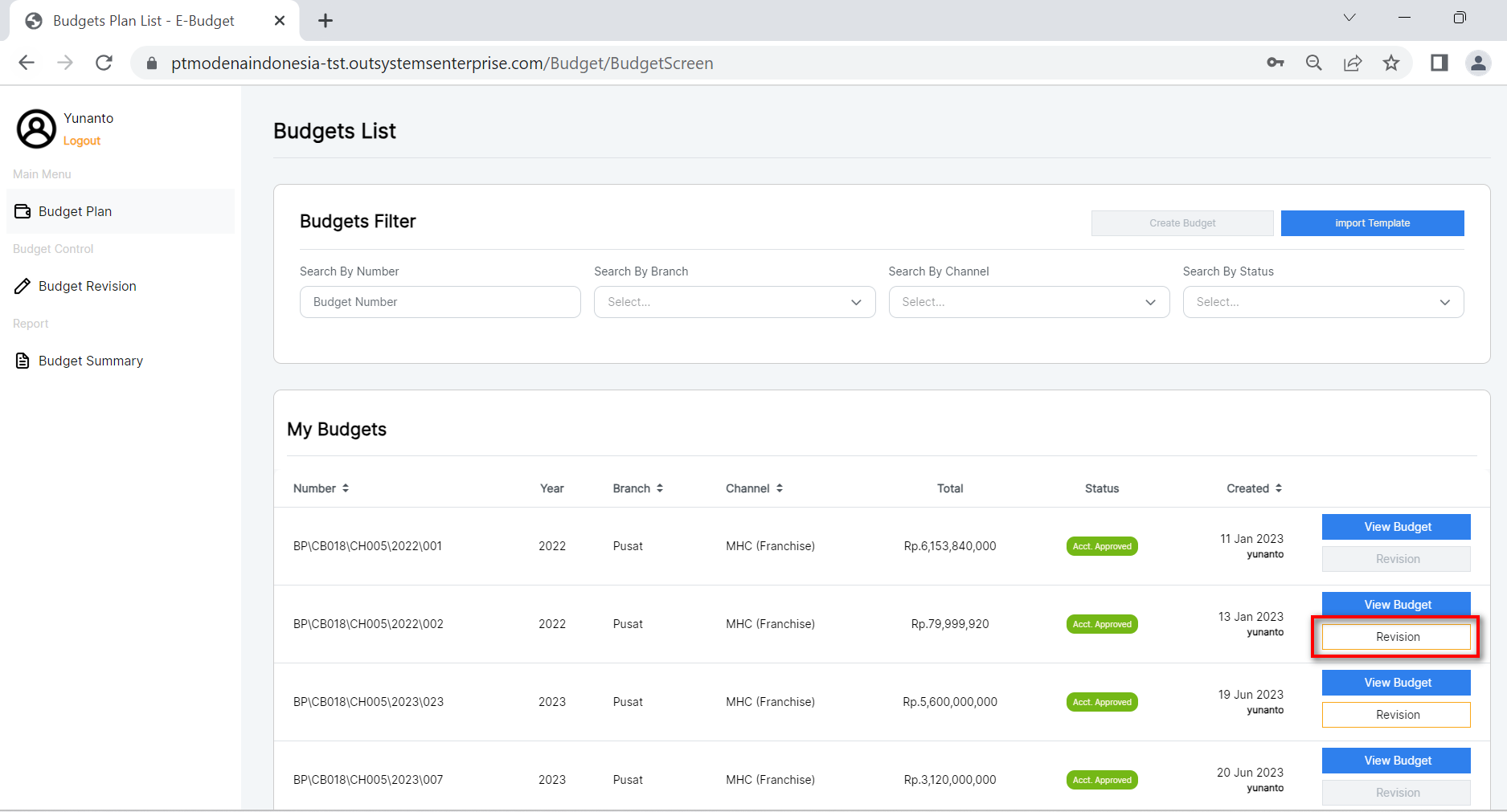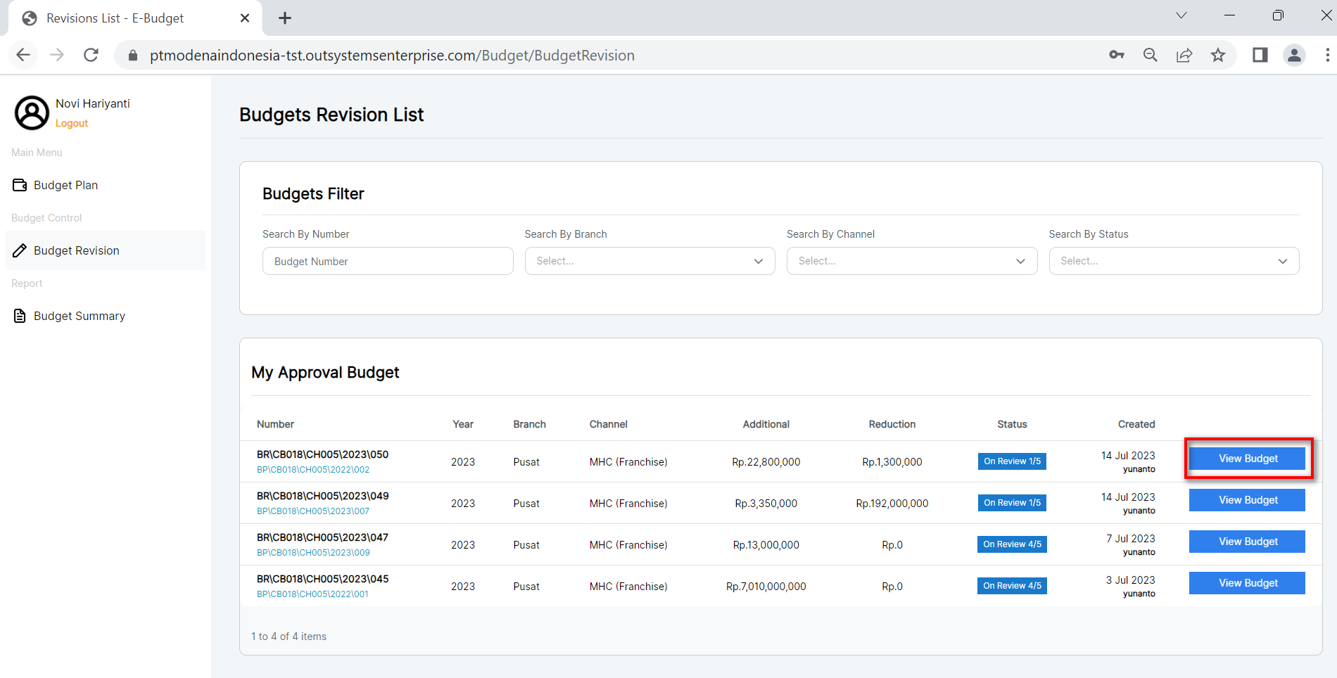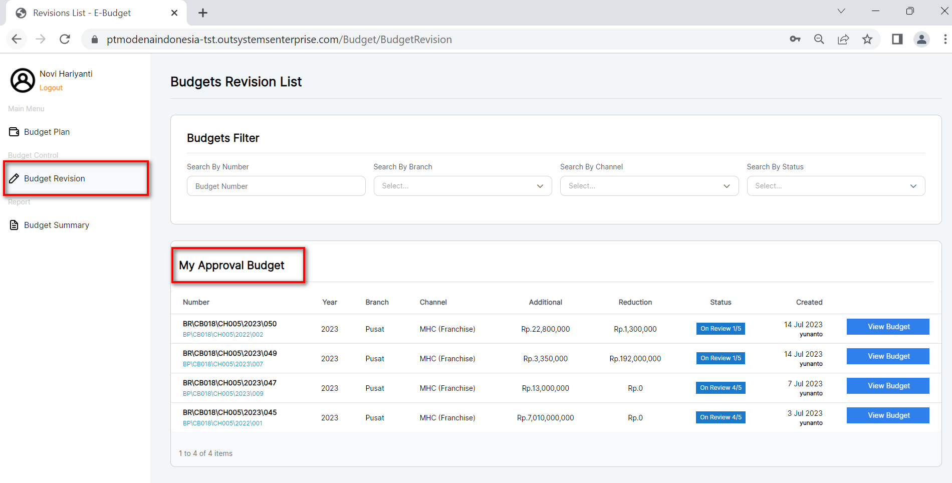- Pilih Menu Budget Revision untuk melihat list revisi yang akan di approve