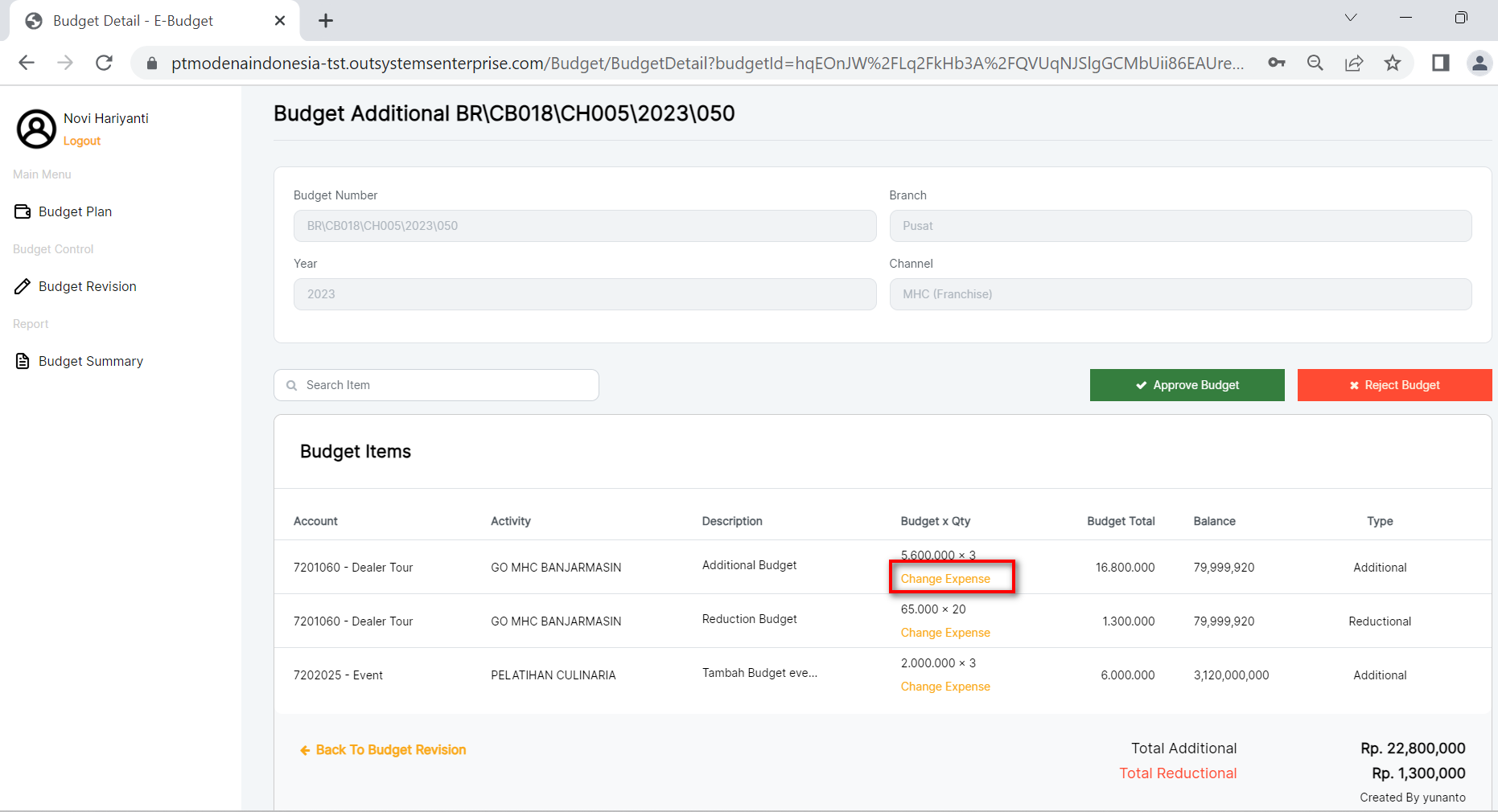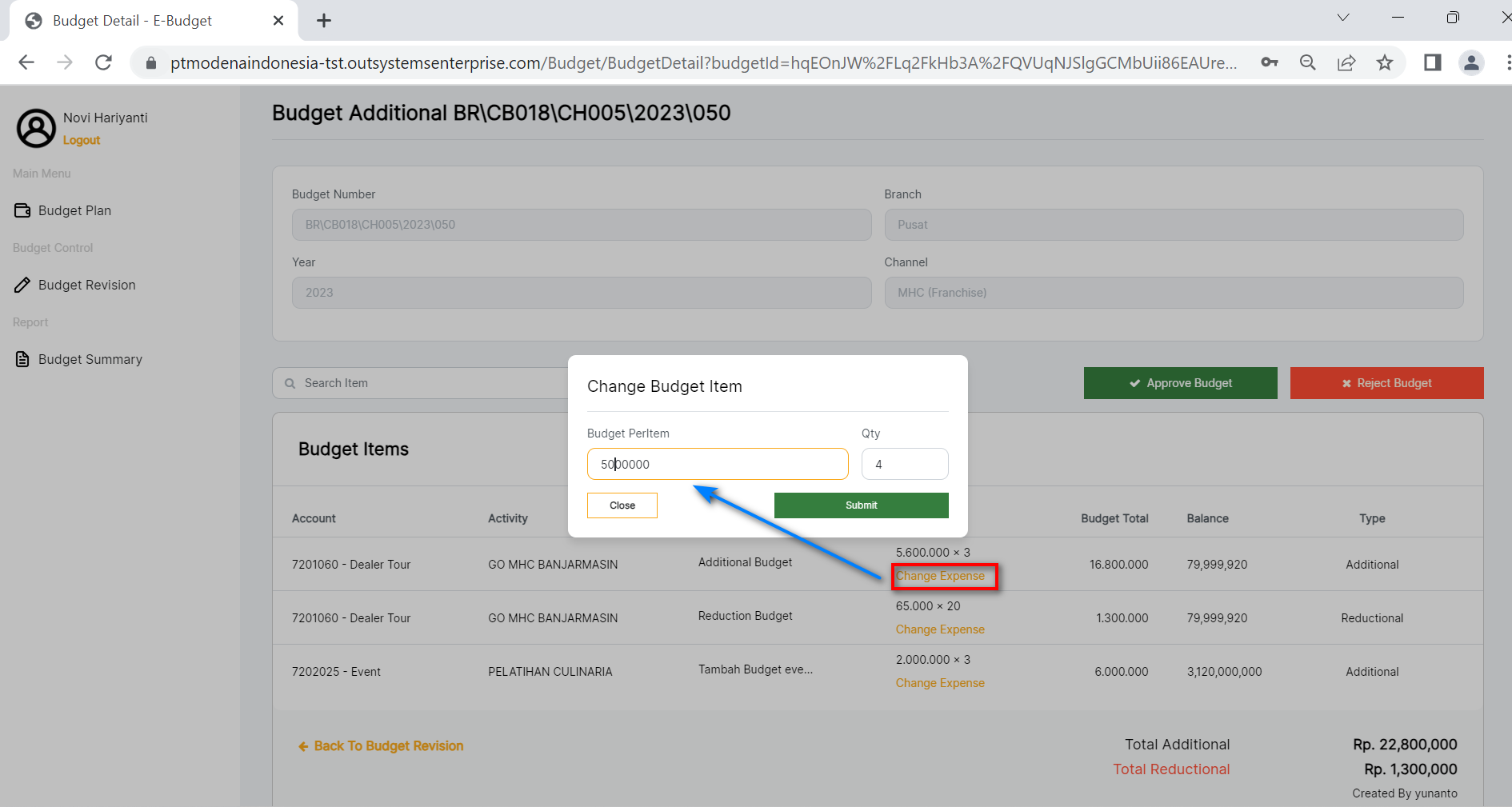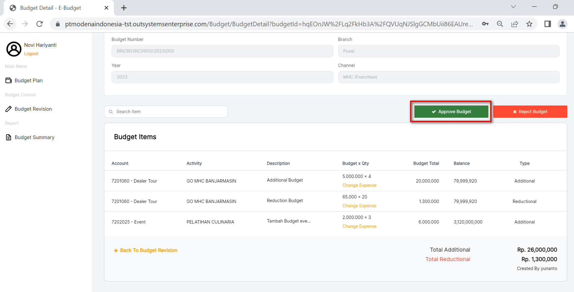 - Sebelum klik Button Approval, Approval dapat melakukan revisi atas amount budget yang diajukan.