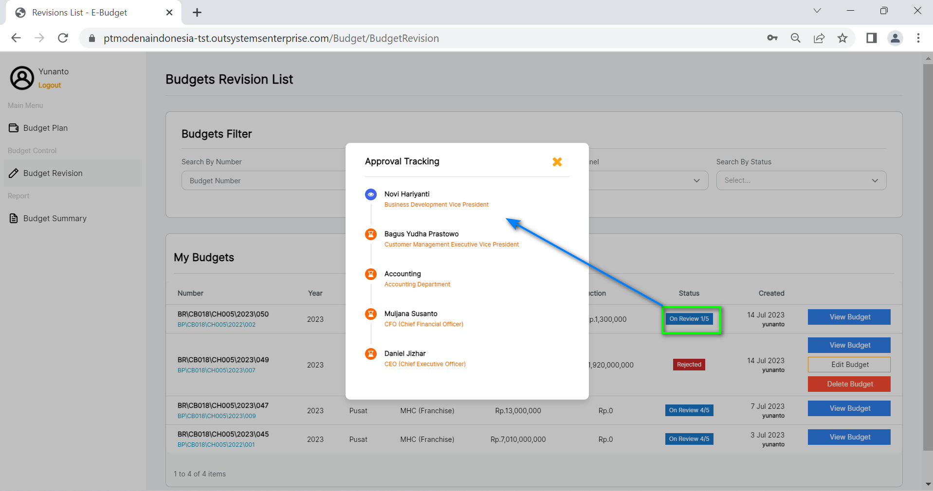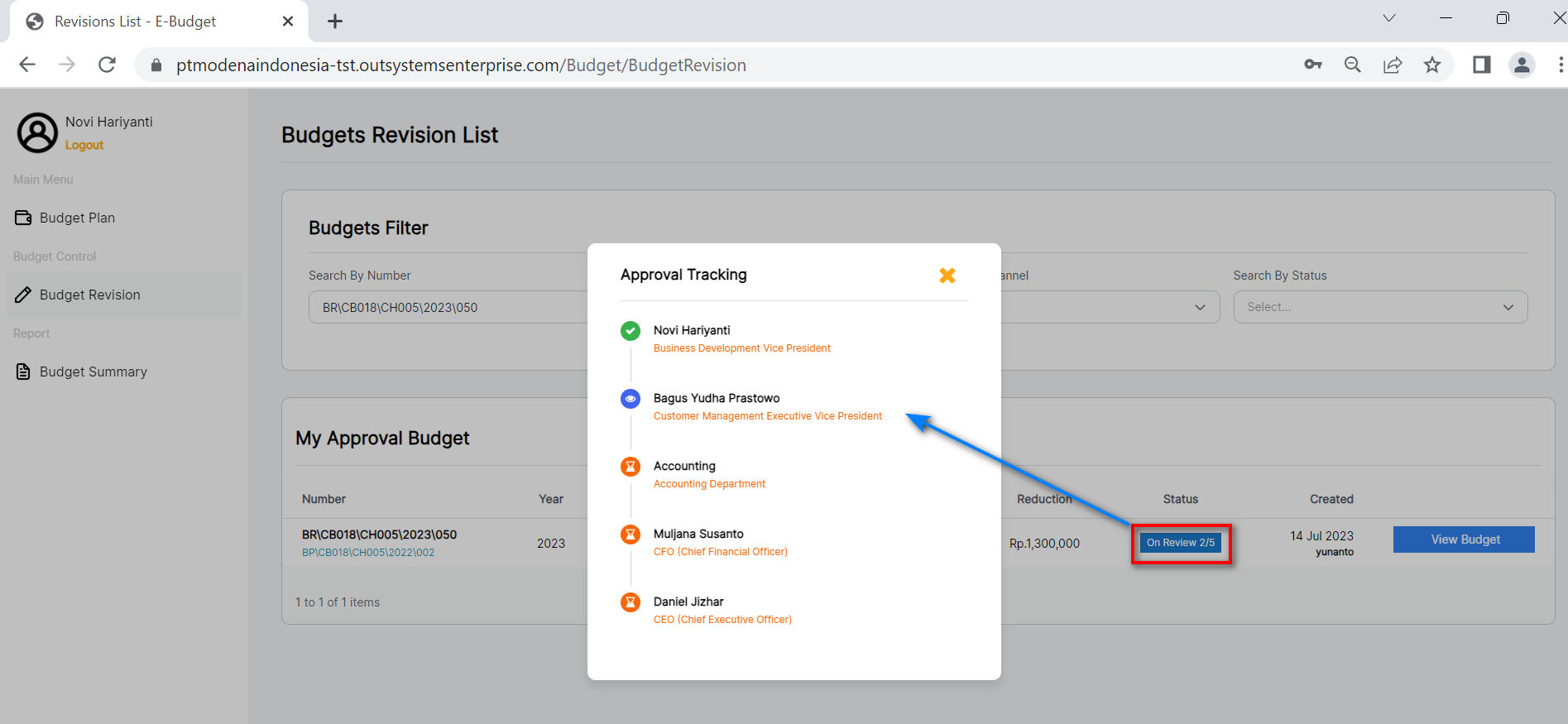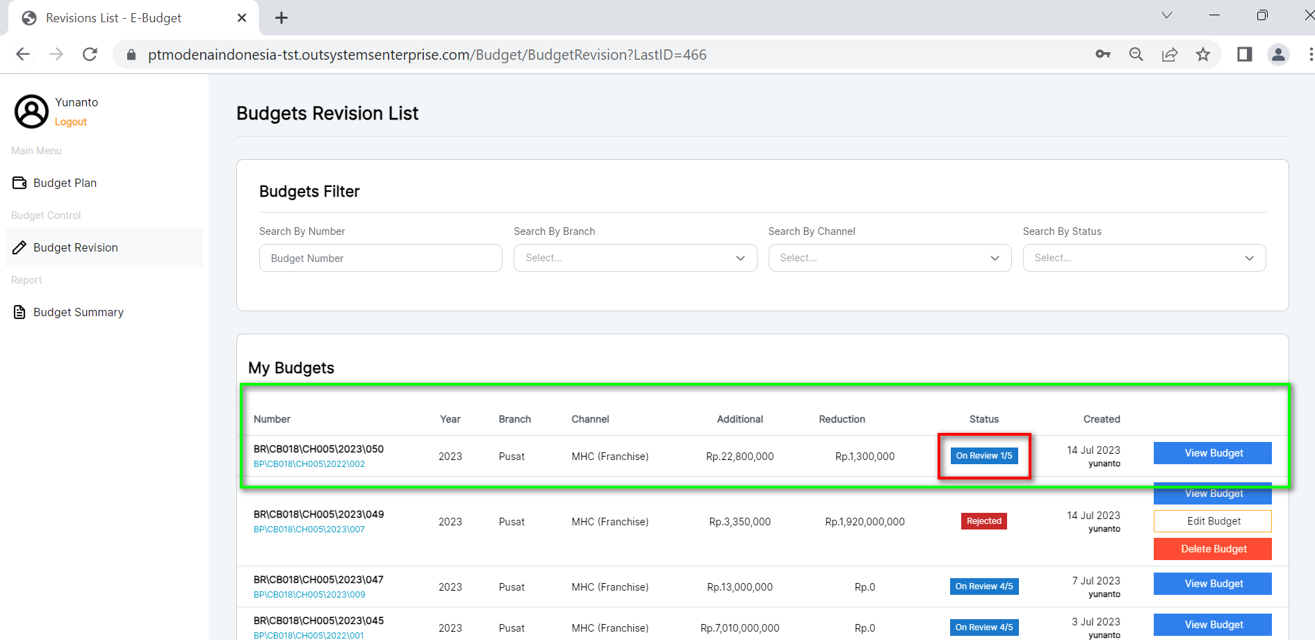 - Apabila Berhasil melakukan pengajuan, status Budget revision akan berubah jadi On Review.