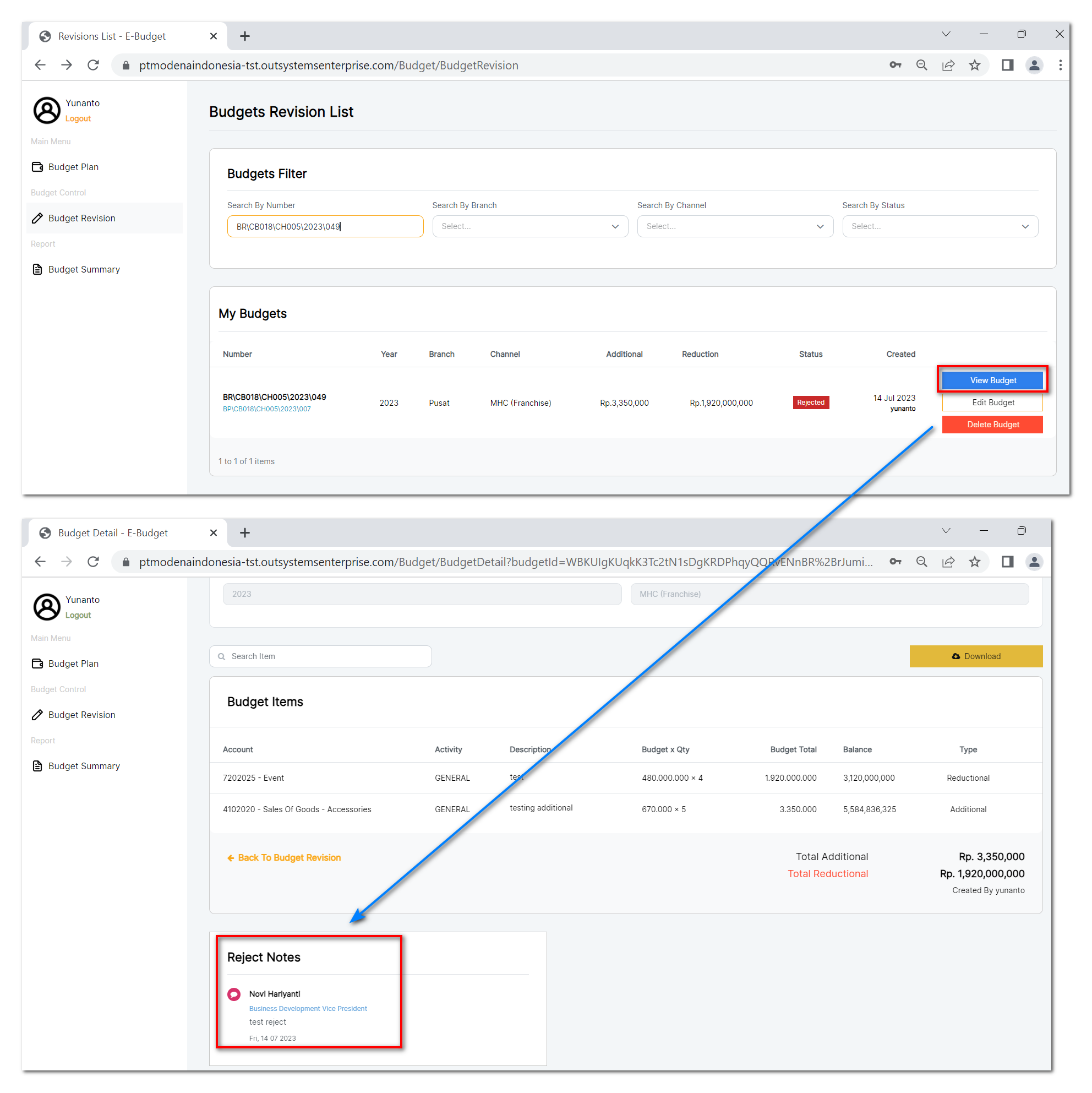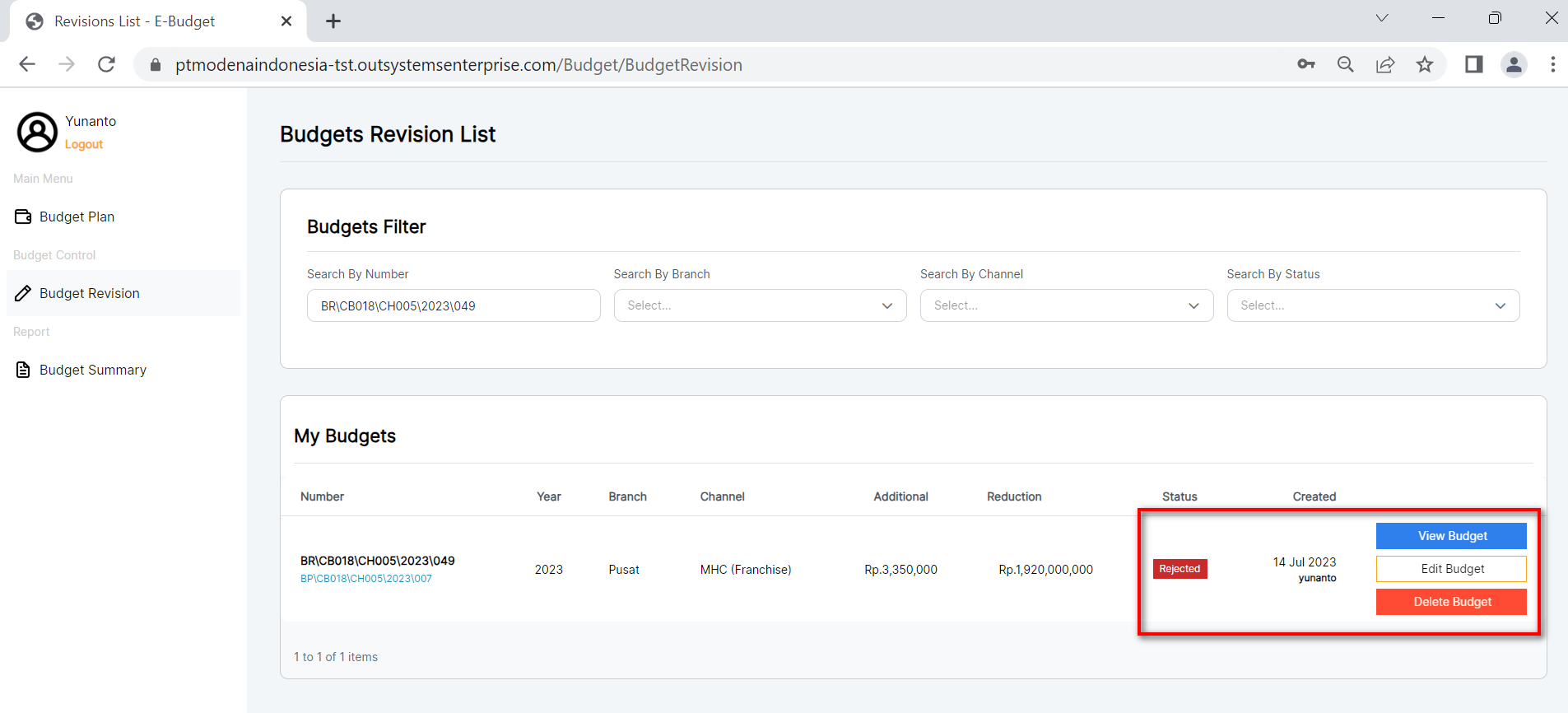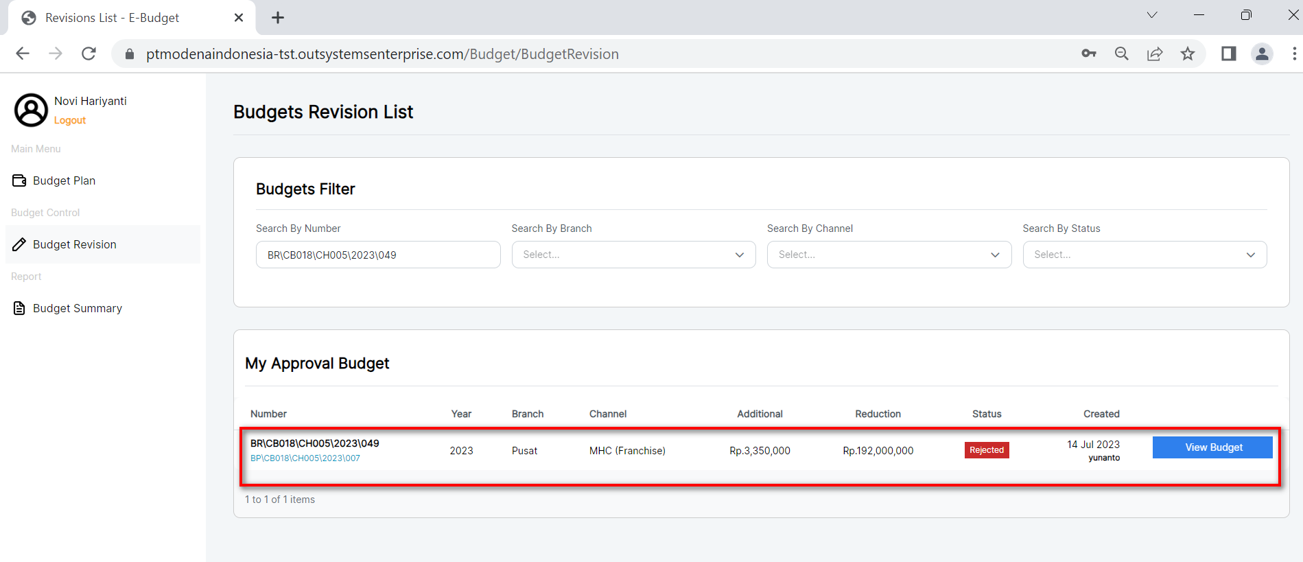 Apabila Approver melakukan Reject atas Budget Revision, Status budget revision akan berubah menjadi Rejected