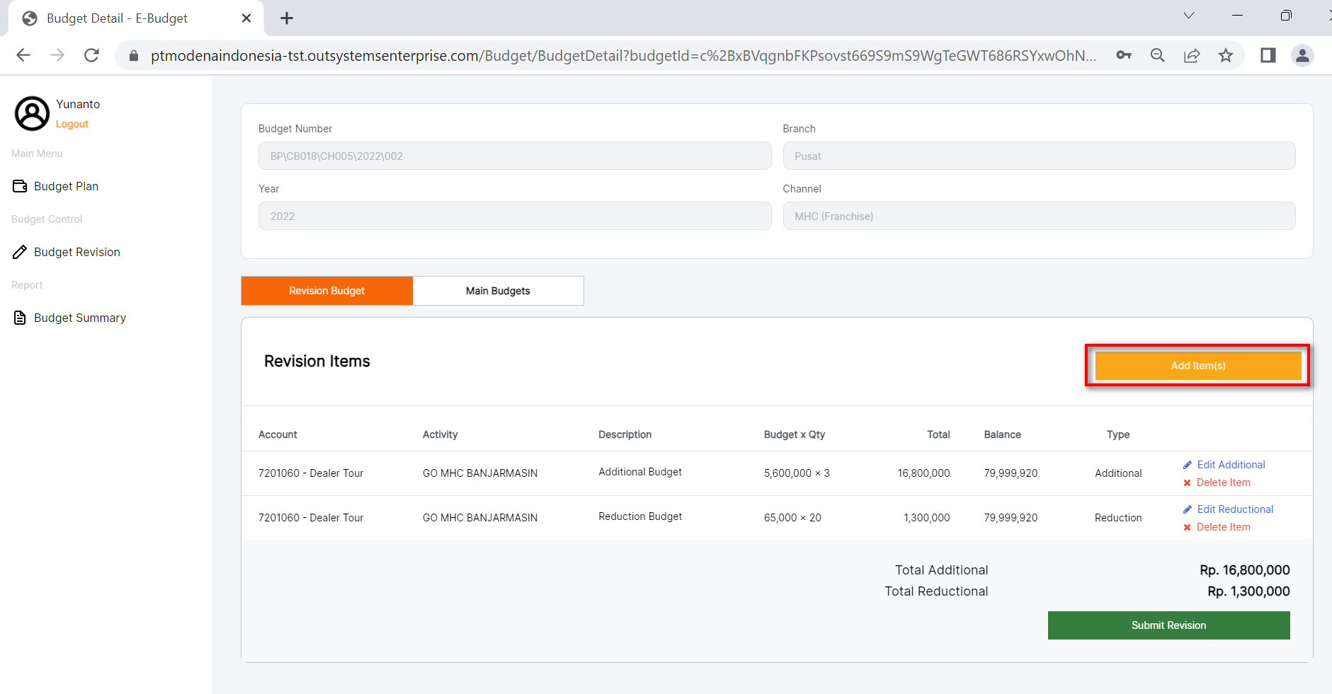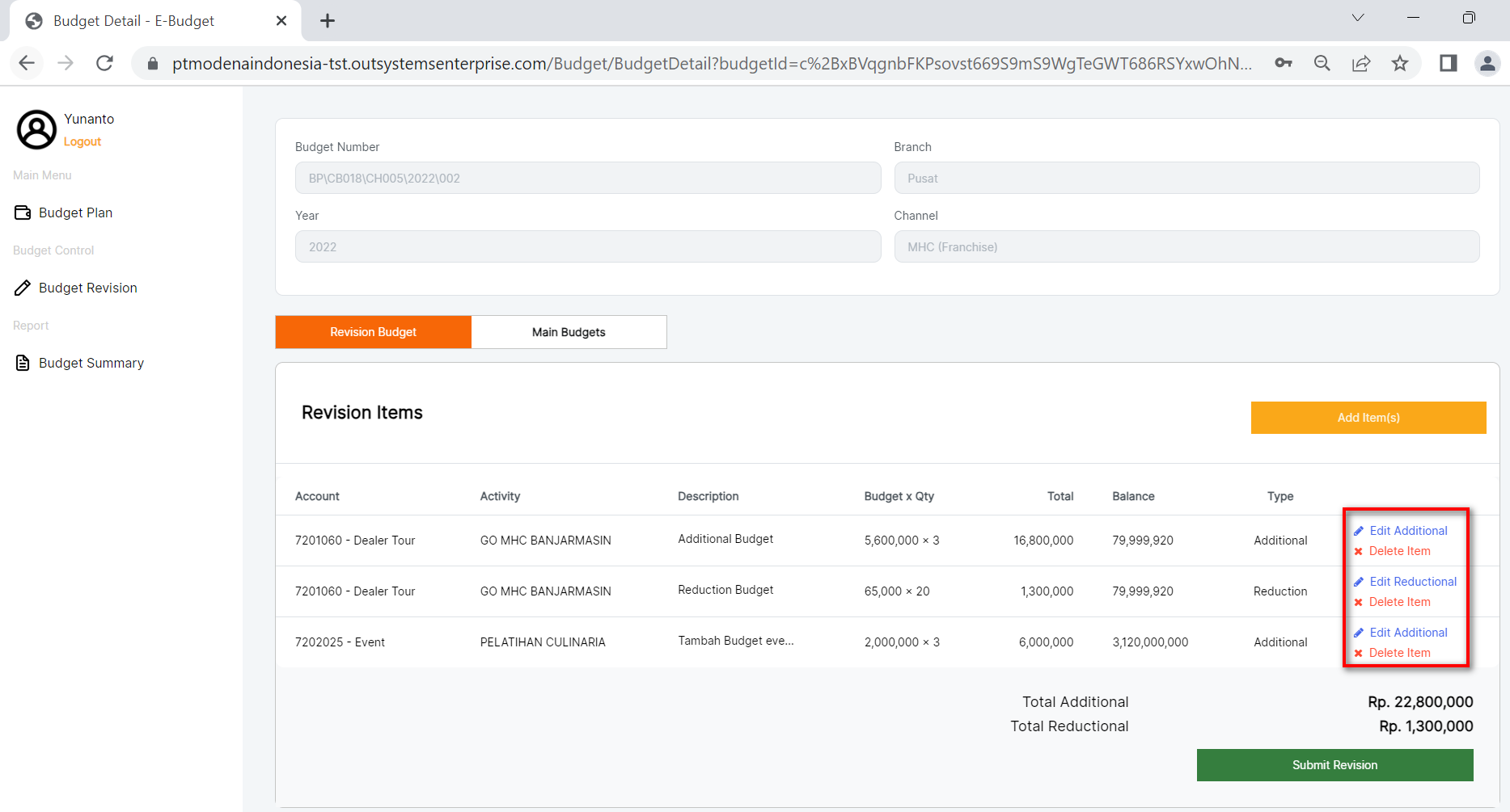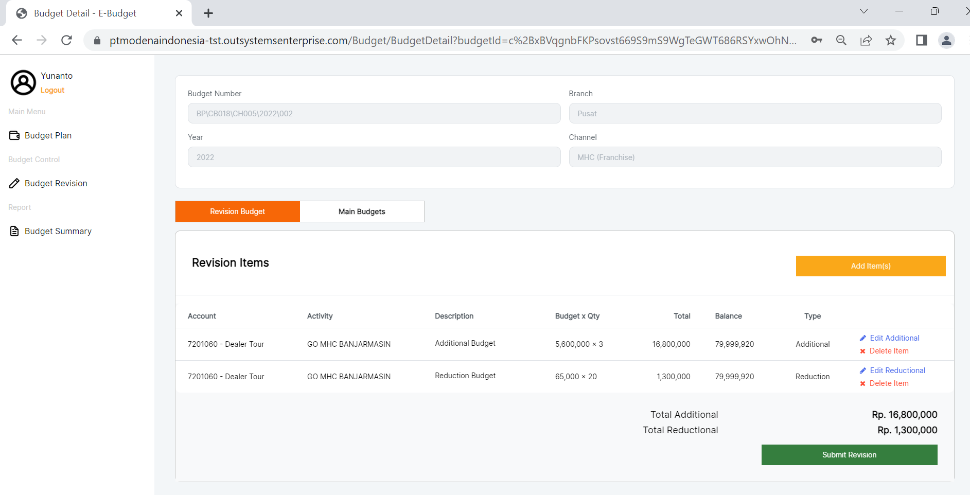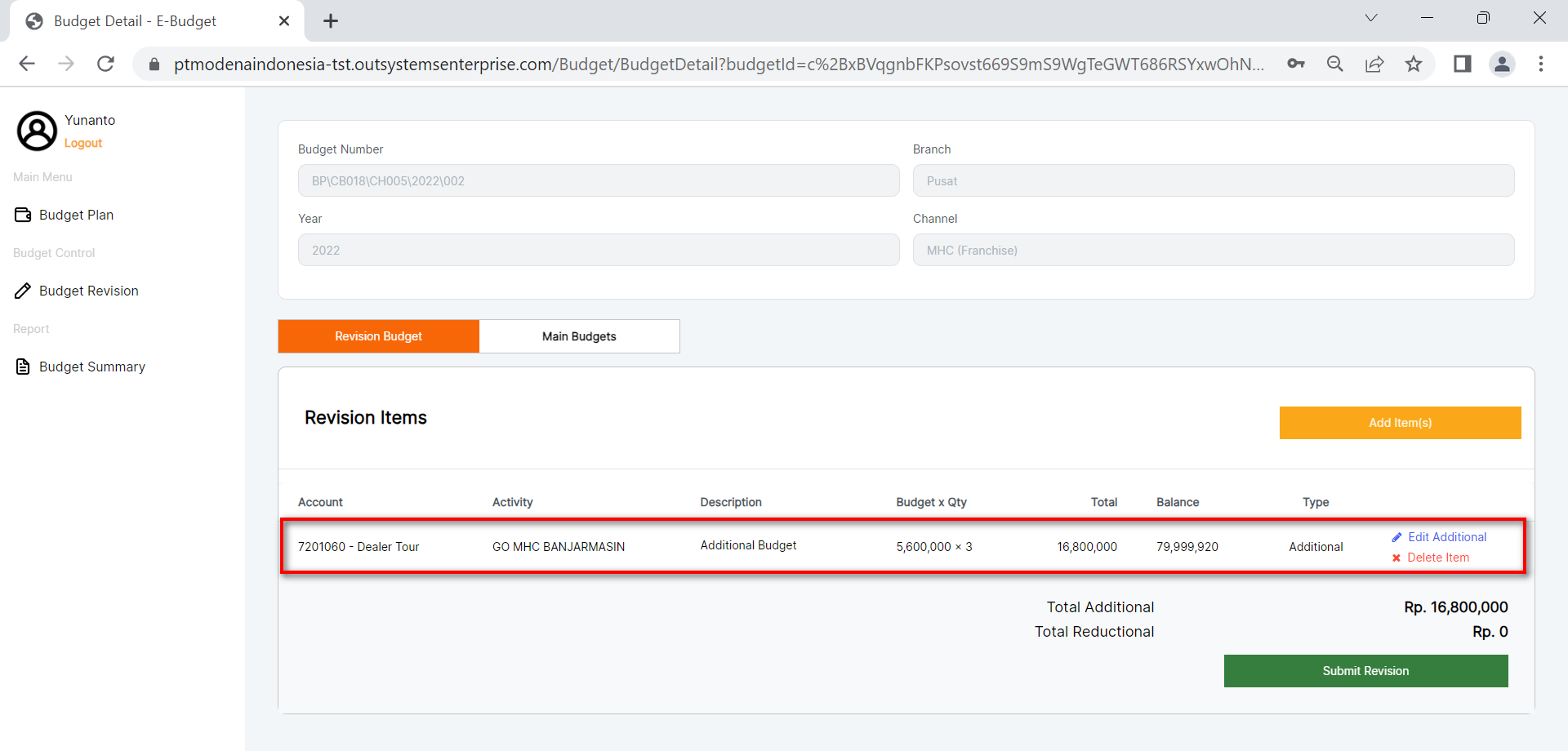 Delete item -> apabila ingin menghapus item - Klik tombol Submit Revision untuk melakukan create Budget Revision