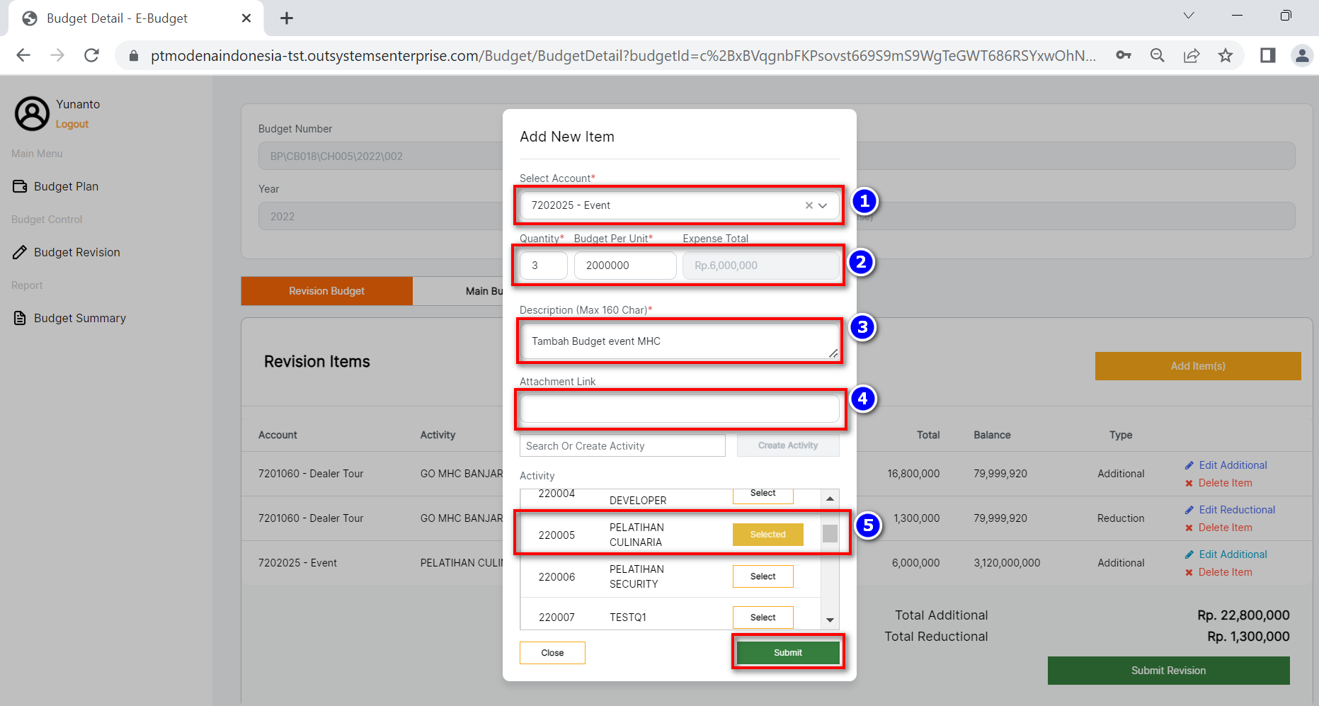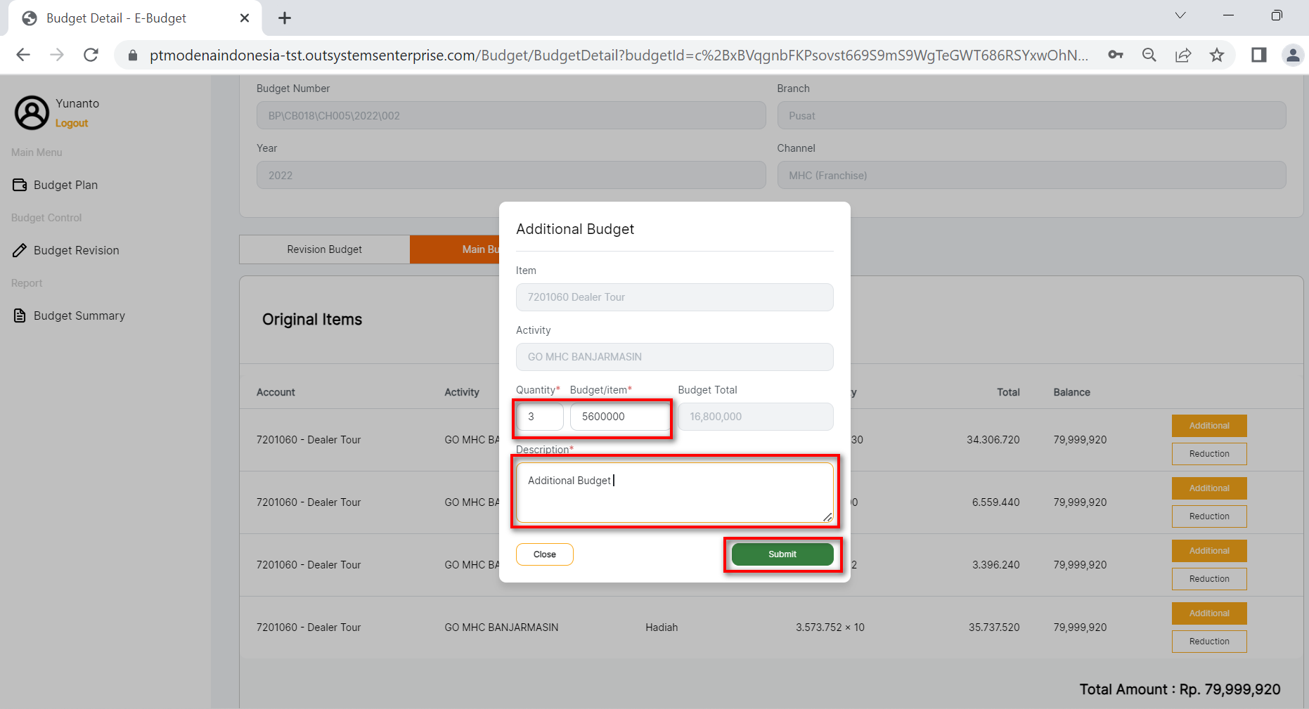 1. Input penambahan Quantity dan Budget Item, Budget Total akan otomatis terisi
