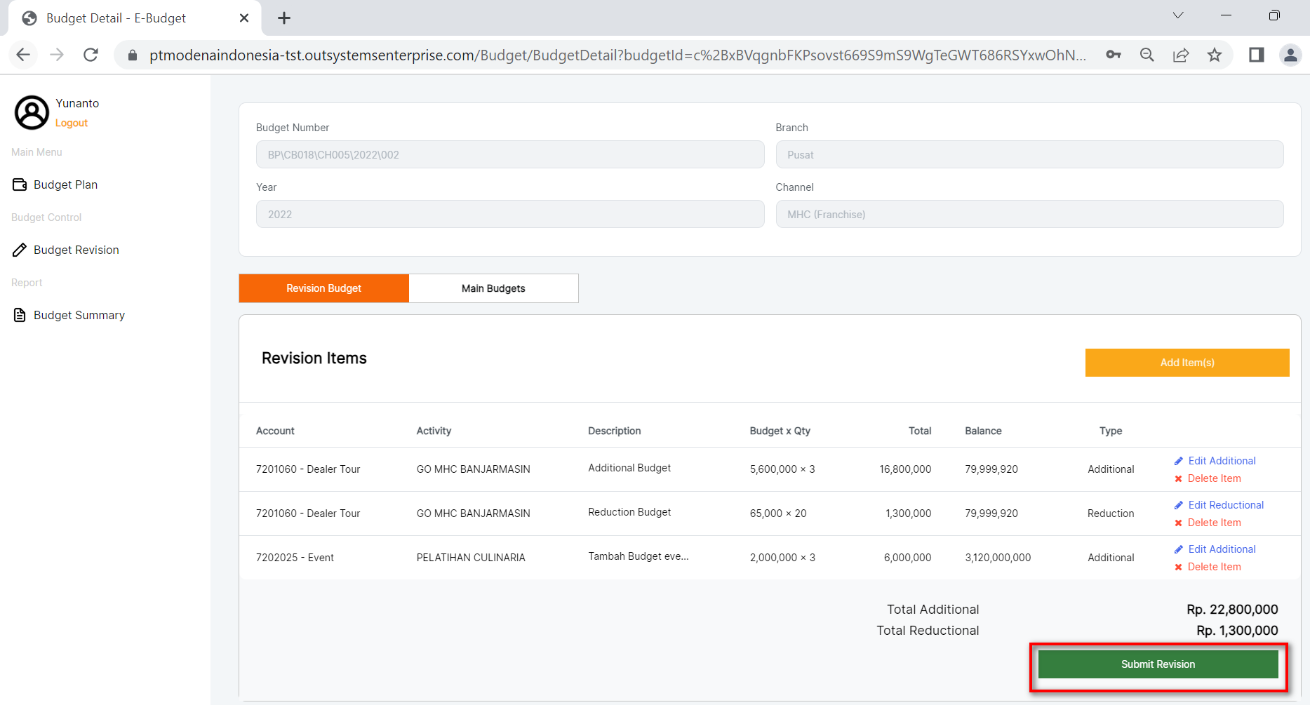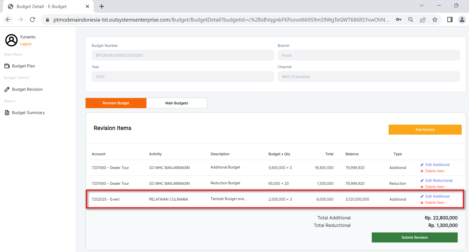 3. Klik Button Submit - Item revision akan muncul di tab Revision Budget