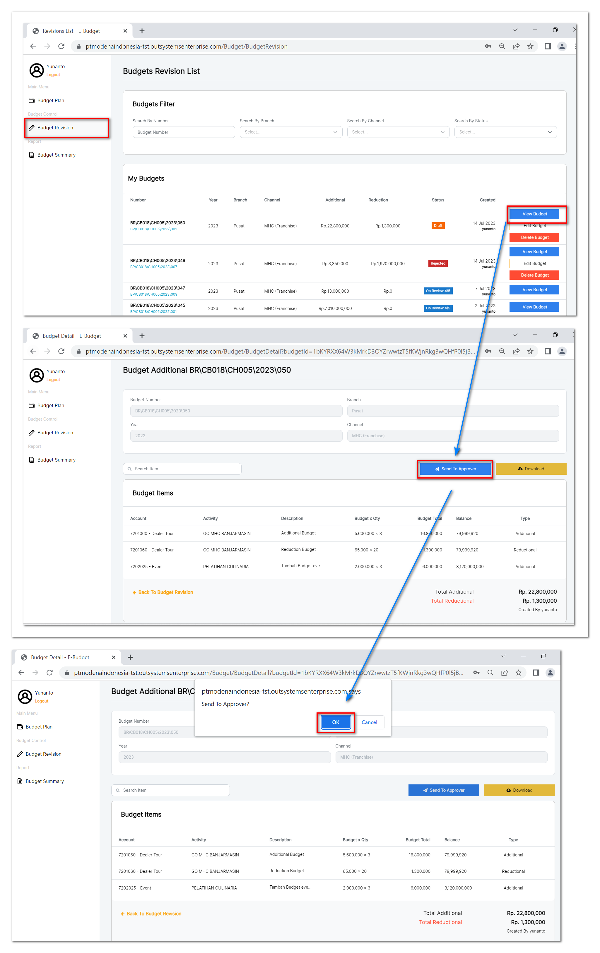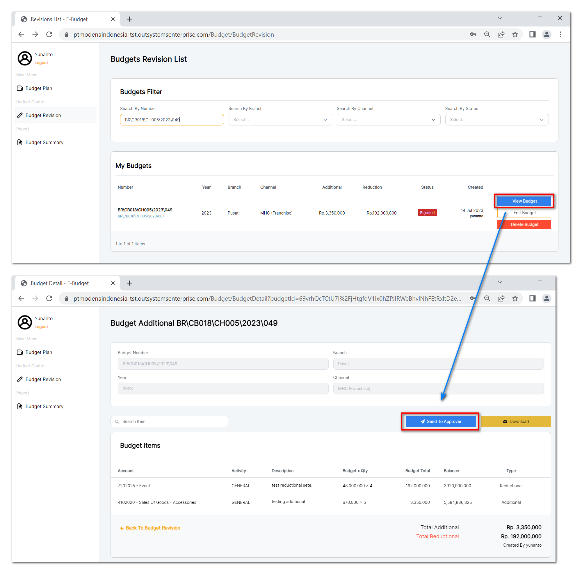 Klik To1mbol View Budget, lalu akan muncul halaman view Budget Revision dan terdapat tombol Send To Approver