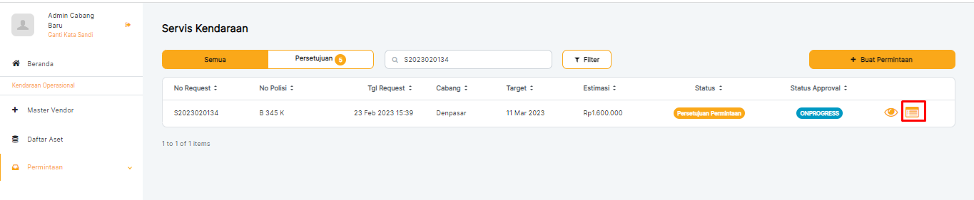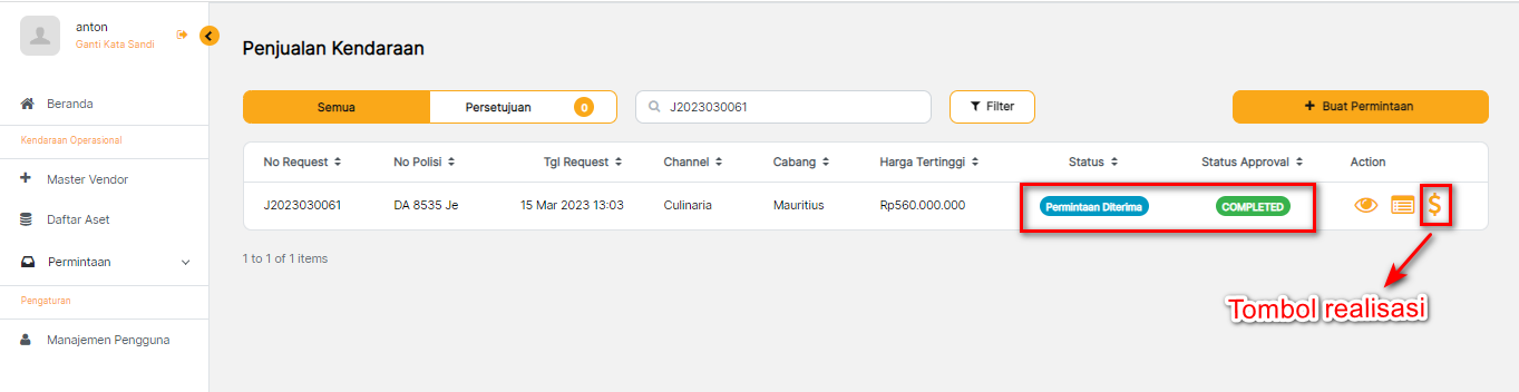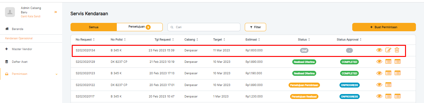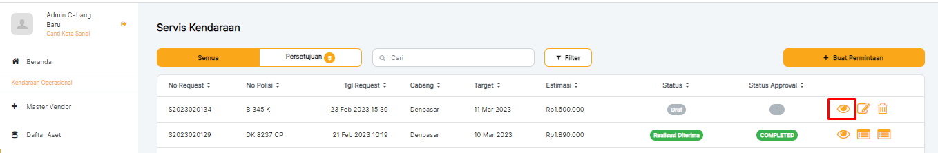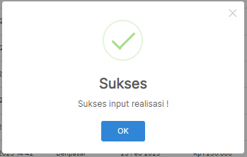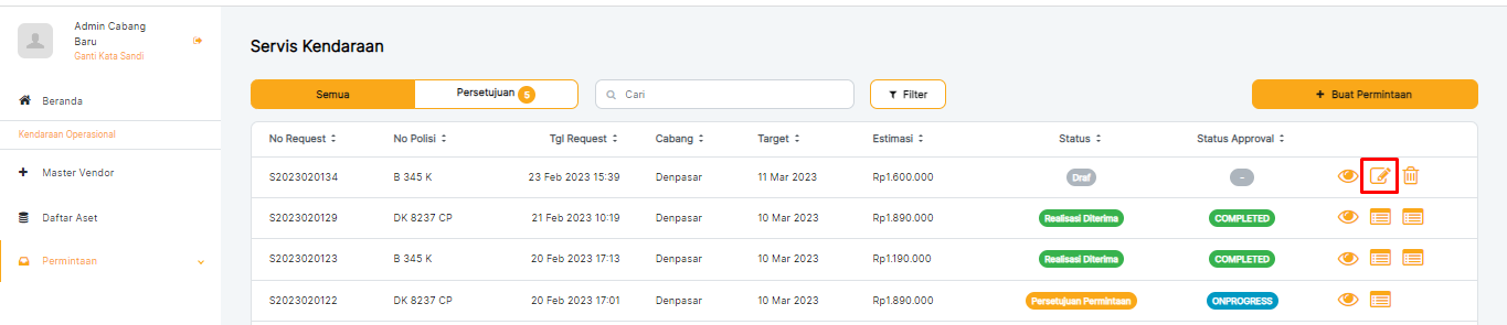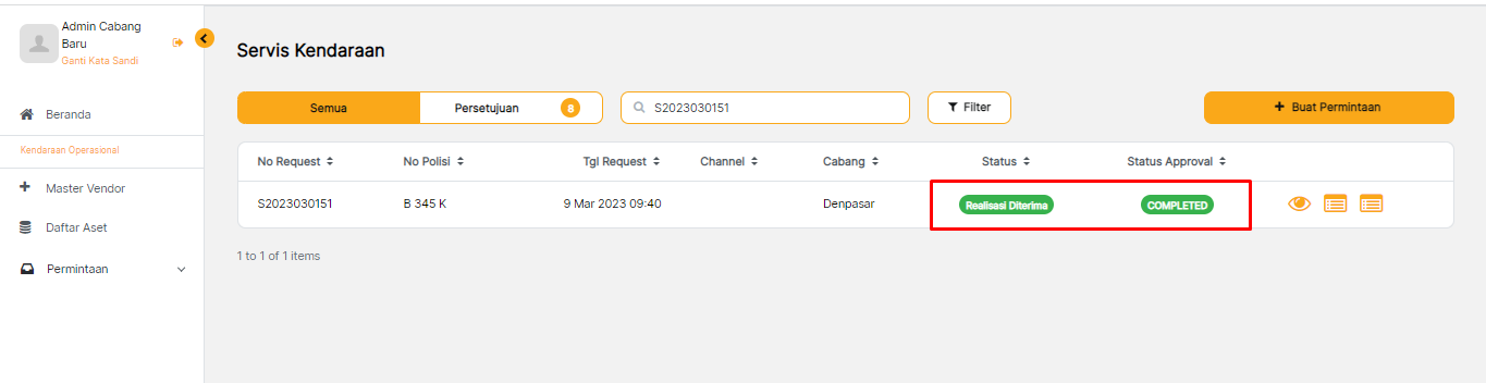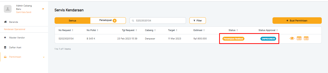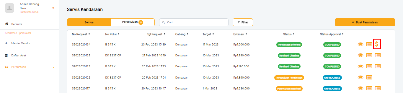 - Setelah Proses Permintaan disetujui hingga Approver terakhir, pada akun admin cabang akan muncul ikon realisasi untuk mengisi data Realisasi
