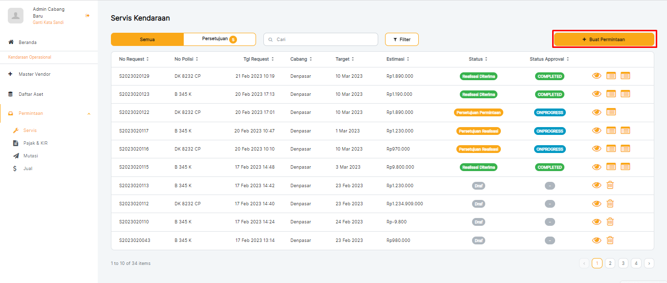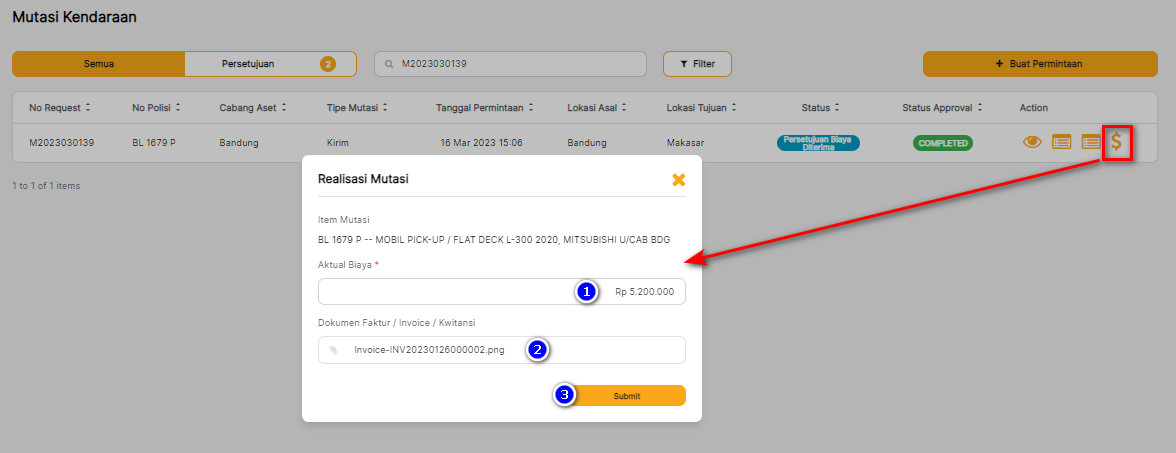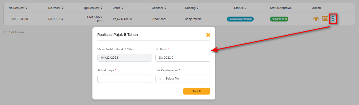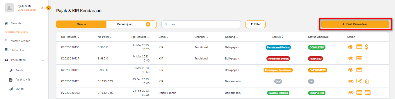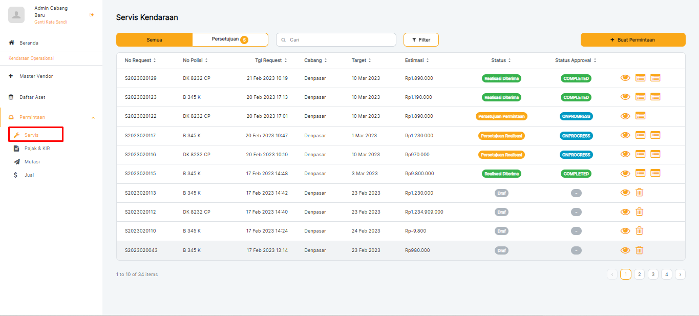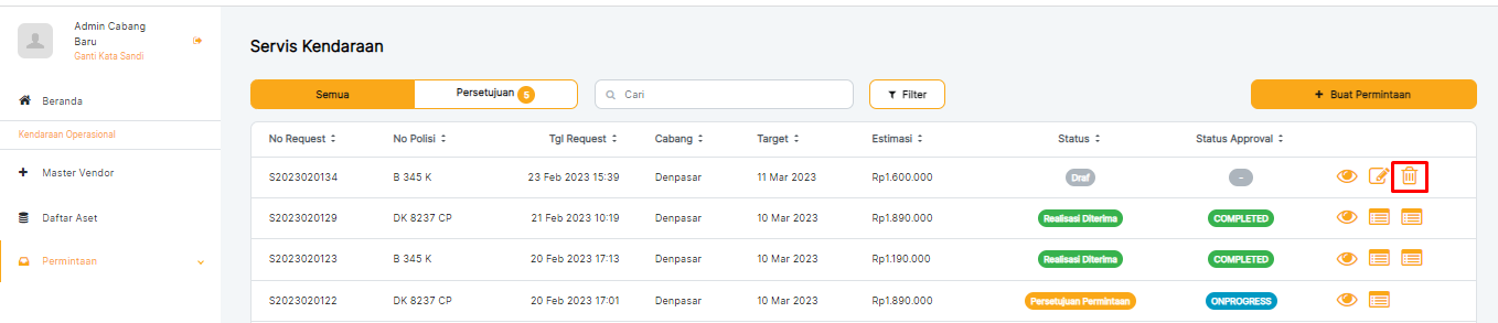 - Setelah Proses Permintaan disetujui hingga Approver terakhir, pada akun admin cabang akan muncul ikon realisasi untuk mengisi data Realisasi