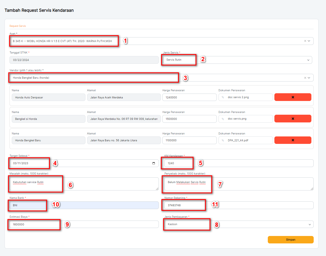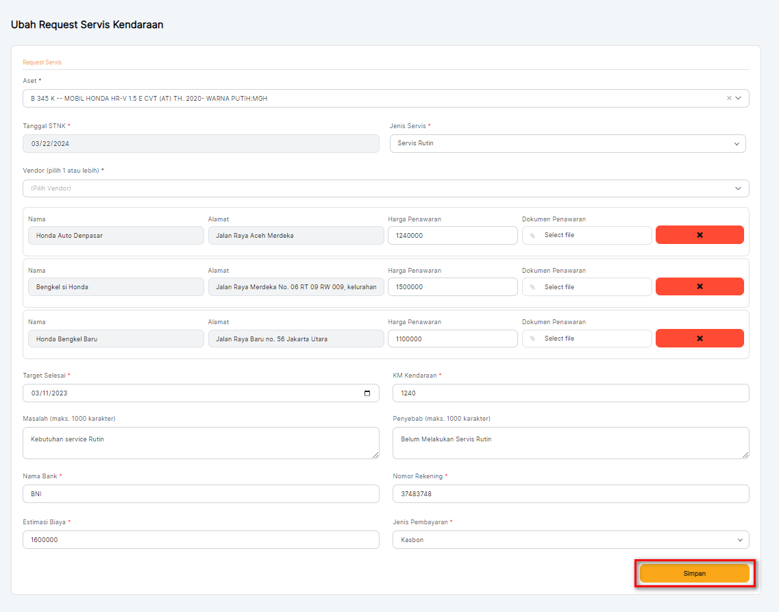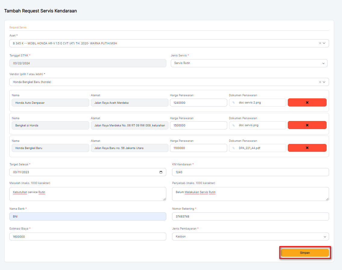 Klik Tombol Simpan untuk menyimpan data Permintaan Servis