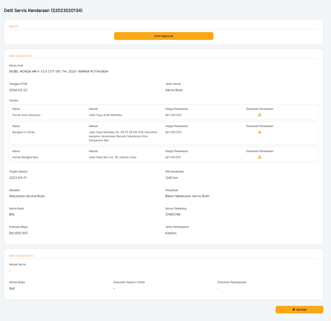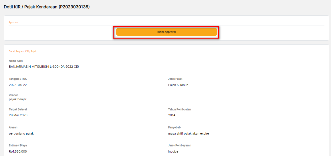 Untuk mengirim approval Permintaan, klik tombol Kirim Approval pada halaman Detail Permintaan
