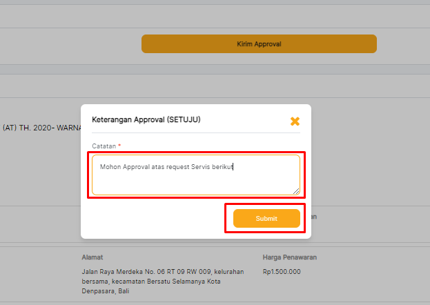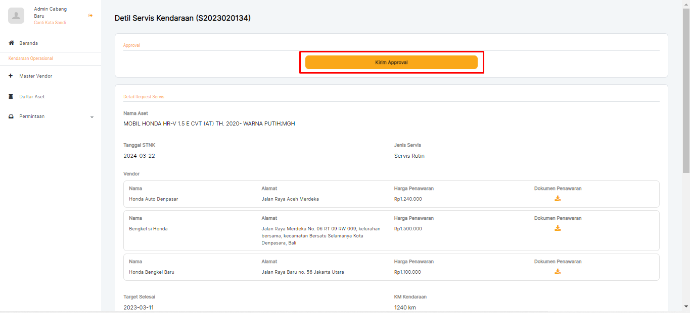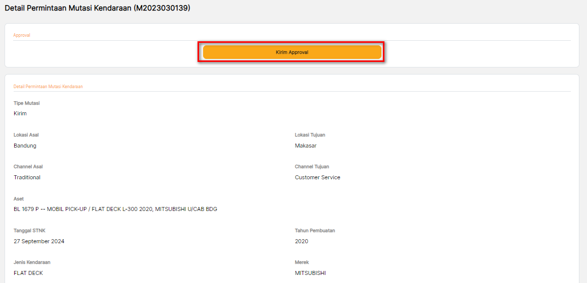 Apabila data permintaan sudah benar, manager cabang/requestor dapat melakukan pengajuan request dengan membuka detail permintaan, lalu klik Kirim Approval
