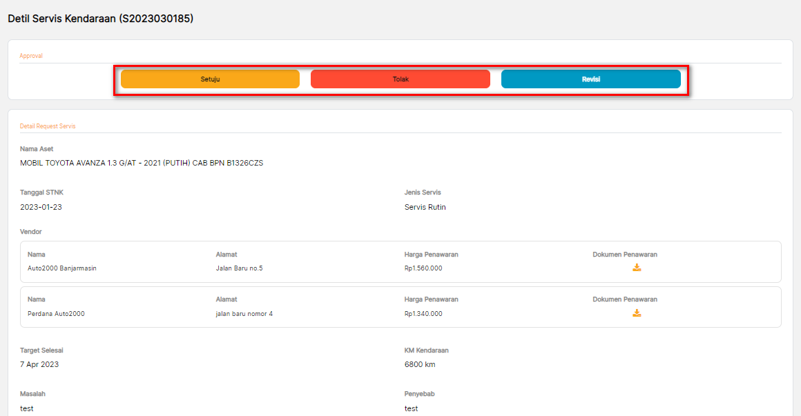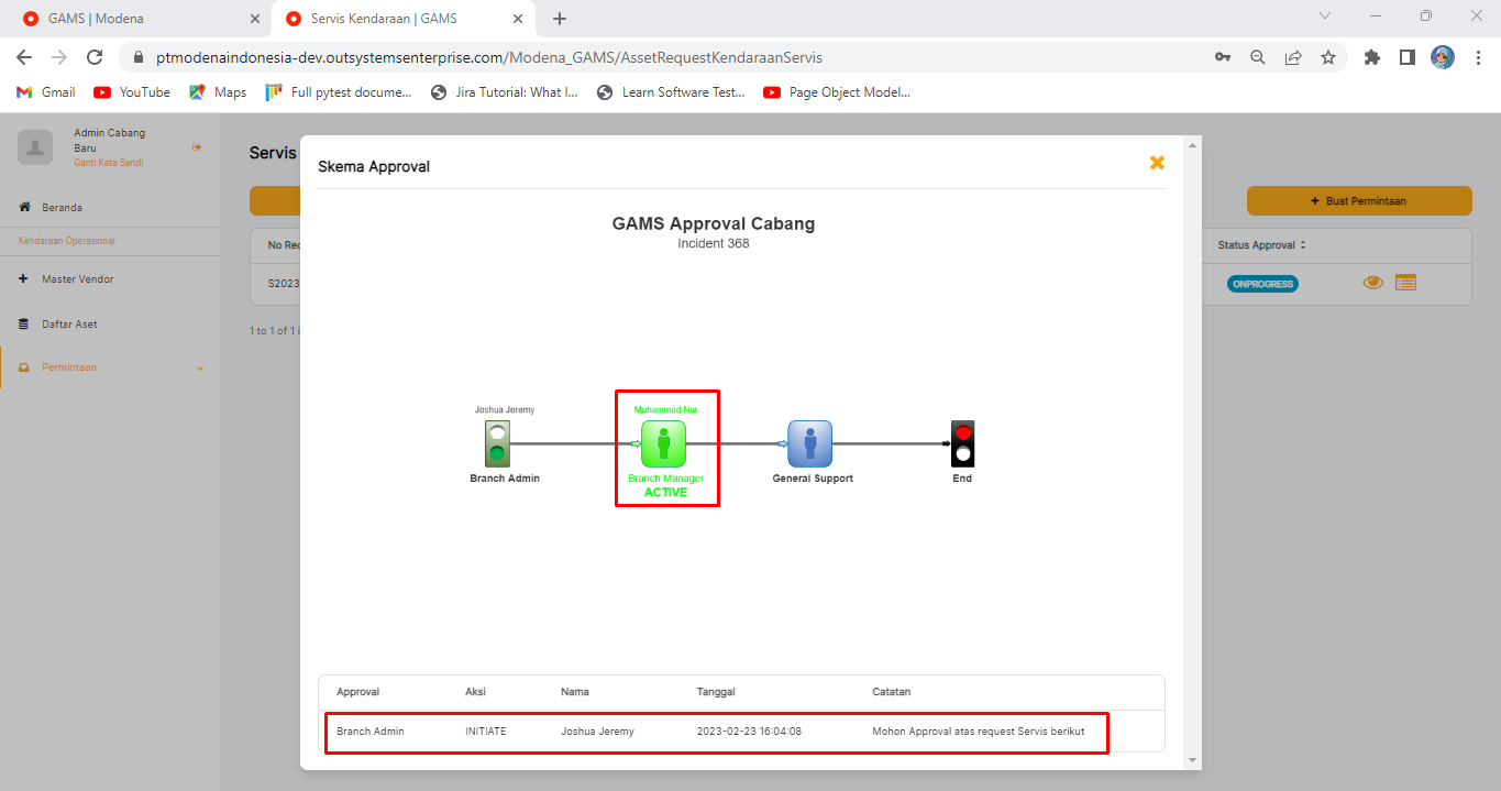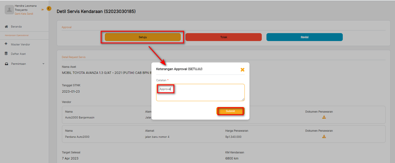 - Pada saat posisi Approval oleh general support, akan ada proses pemilihan Vendor Servis