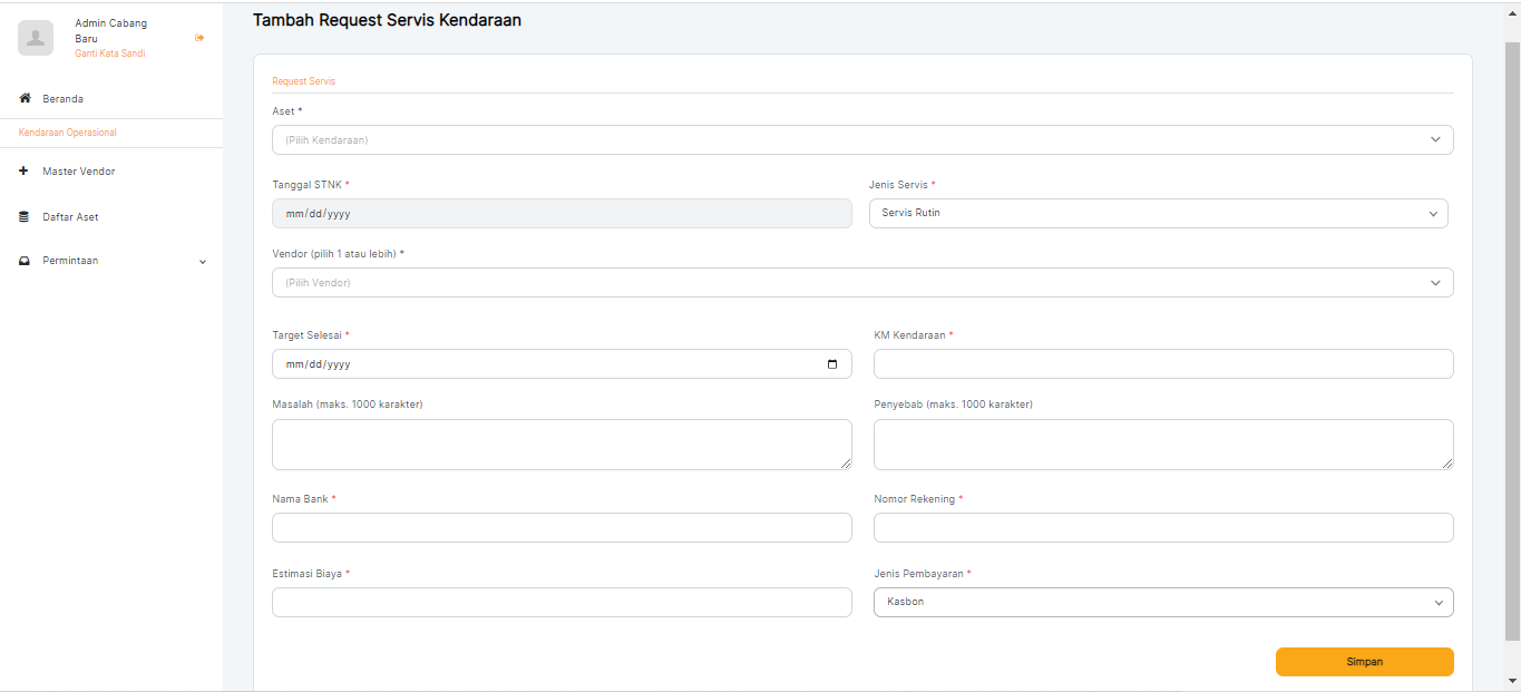 Field aset >> akan menampilkan list aset atas cabang si admin