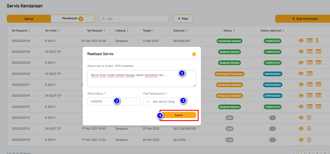 Untuk data Servis dengan Jenis Pembayaran Kasbon, Ketika klik submit akan mengirim approval ke pihak GS.
