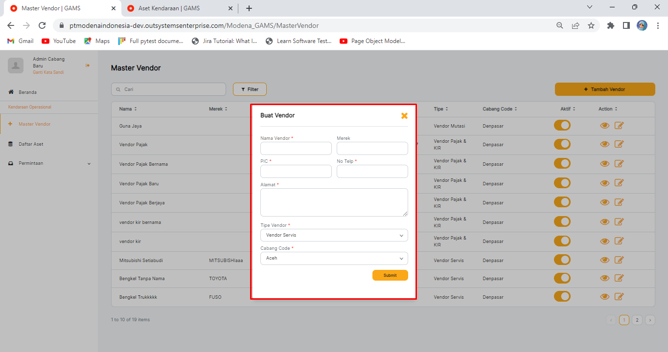 Menampilkan list vendor yang akan digunakan pada permintaan Service, Pajak & KIR, dan Mutasi Kendaraan