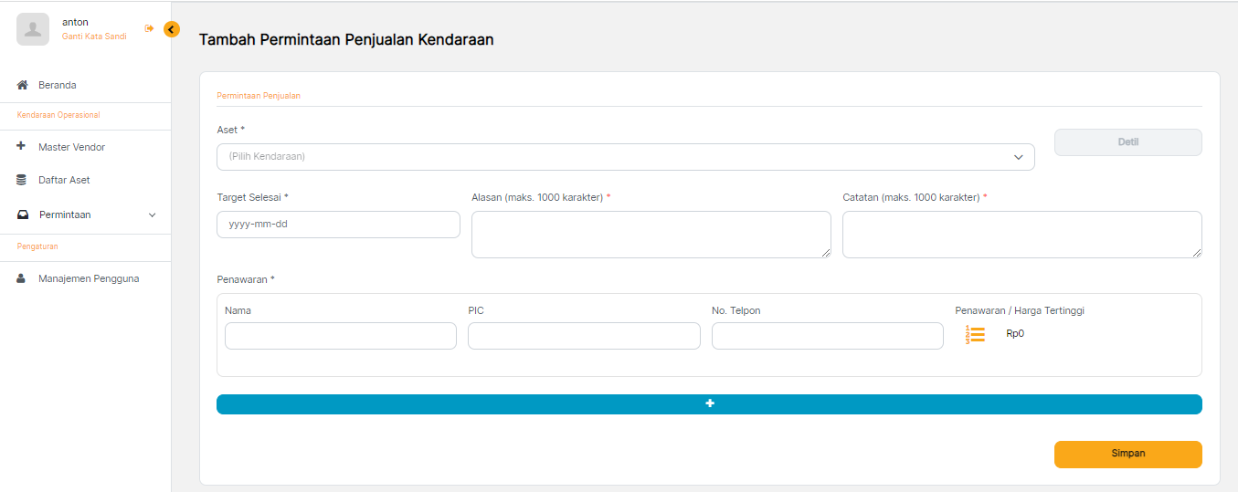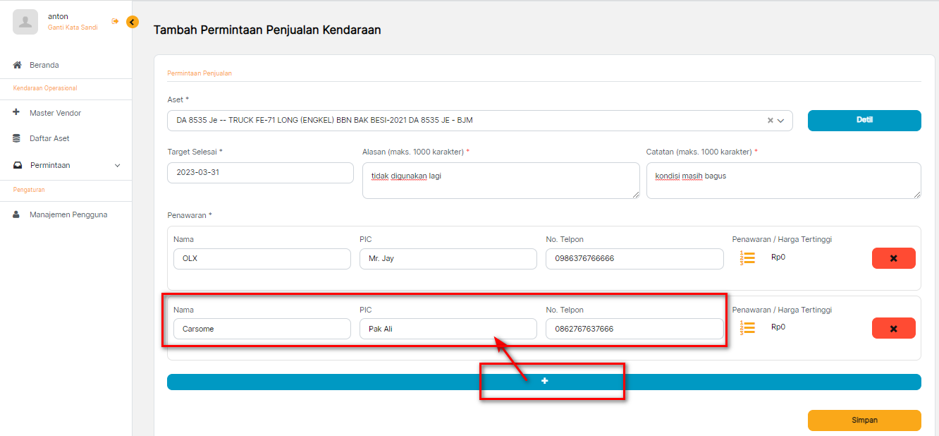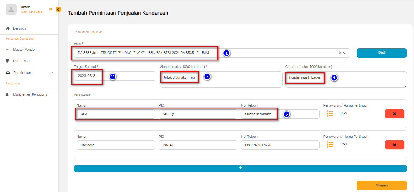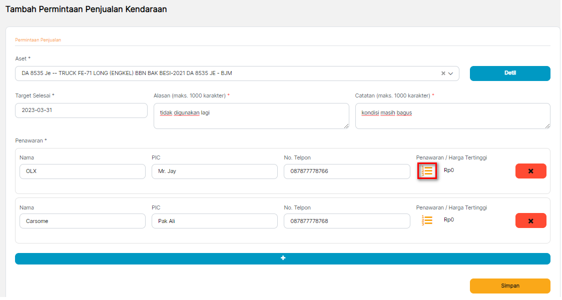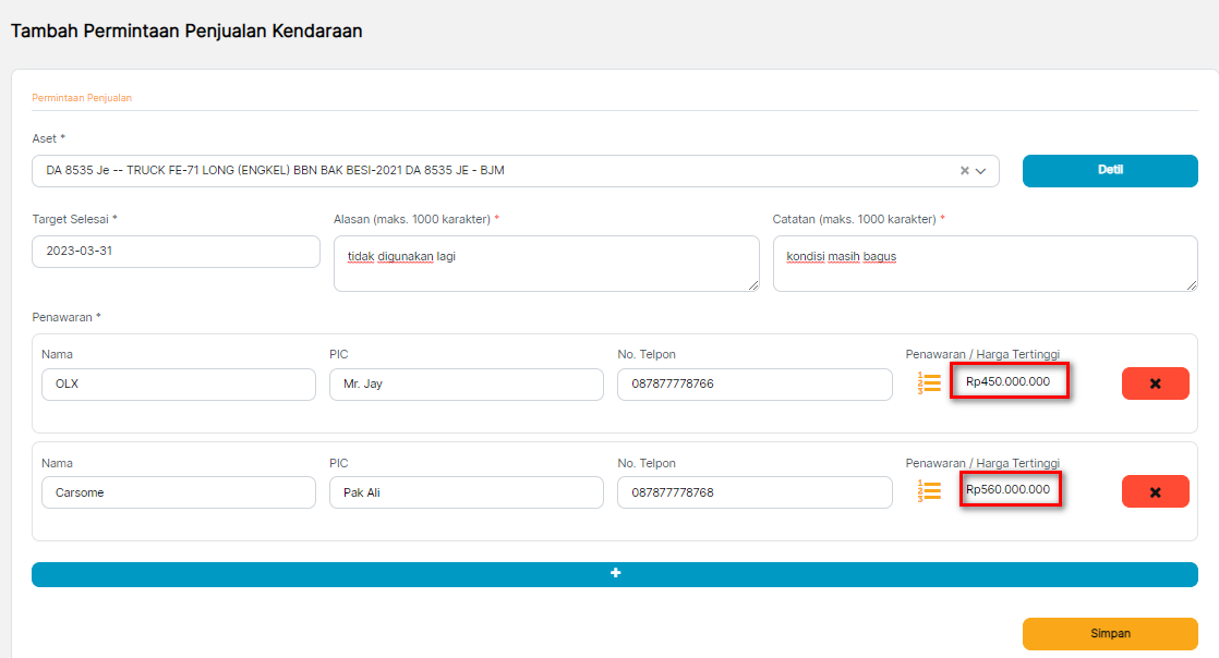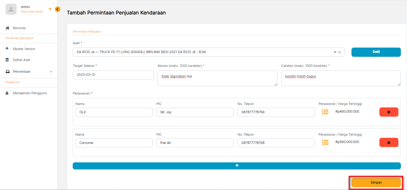 - Klik Tombol Simpan untuk menyimpan data Penjualan kendaraan