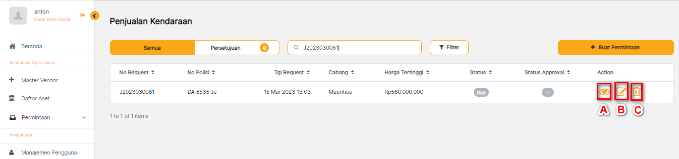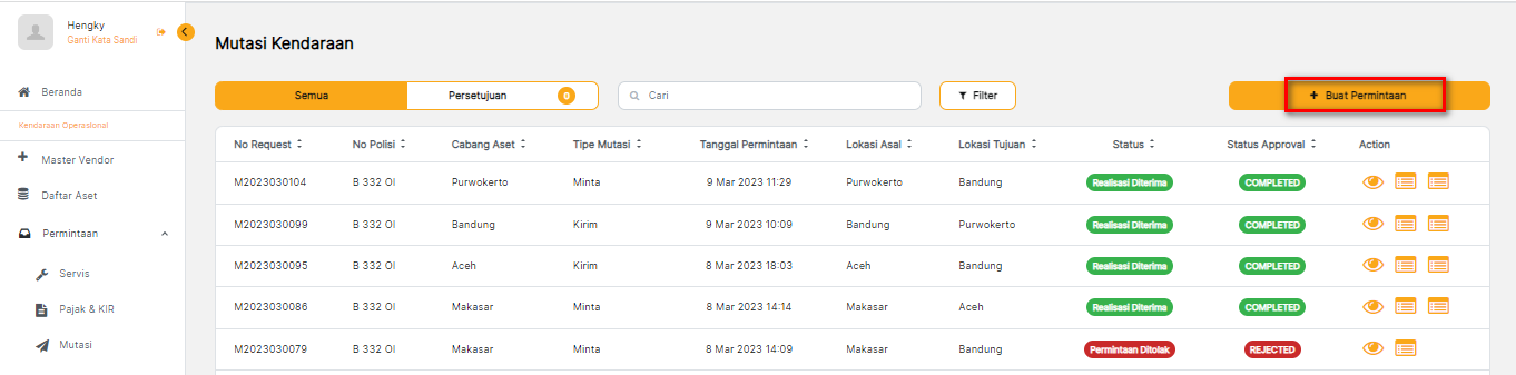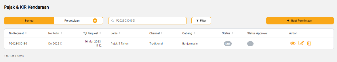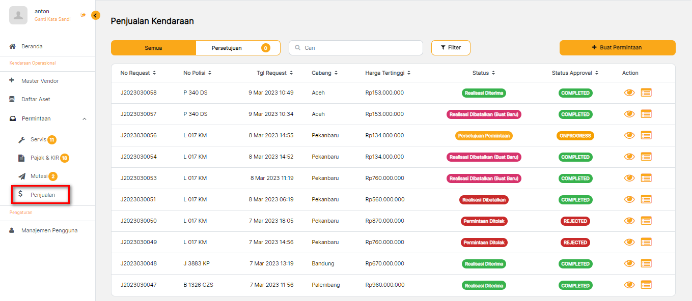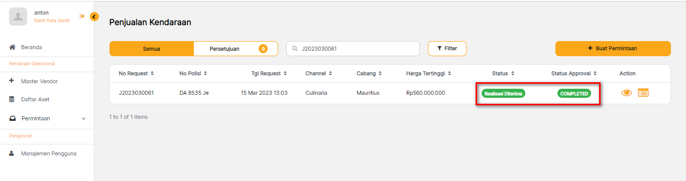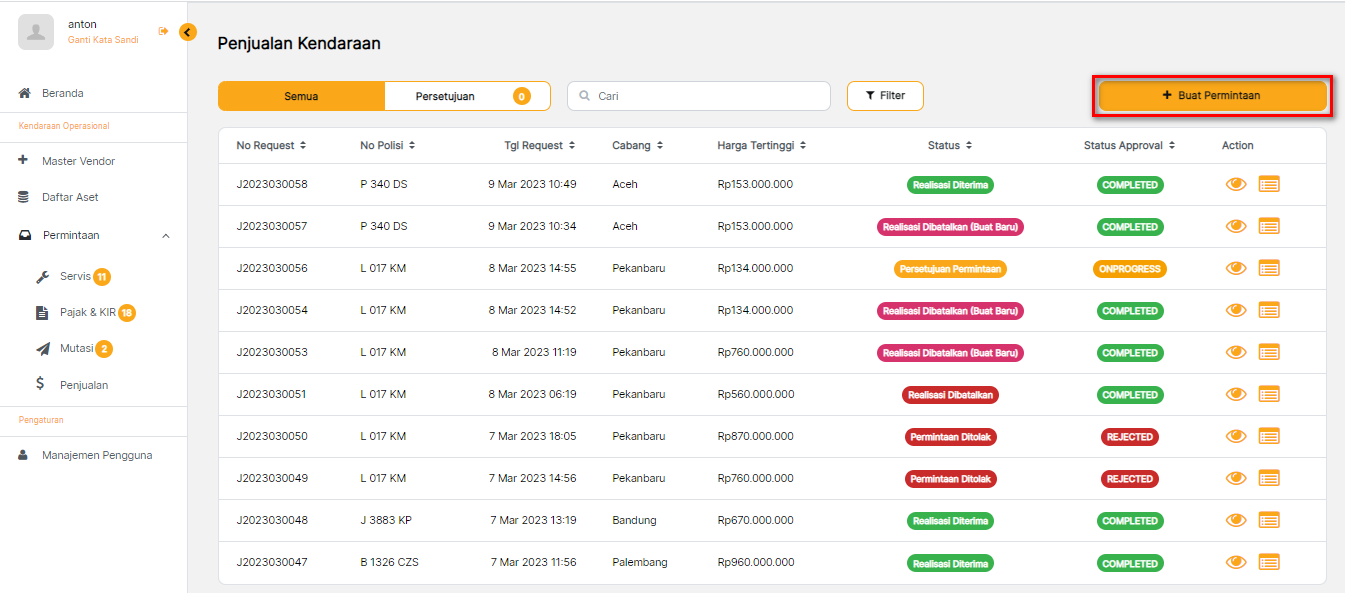Data Permintaan yang berhasil dibuat akan muncul di list Permintaan