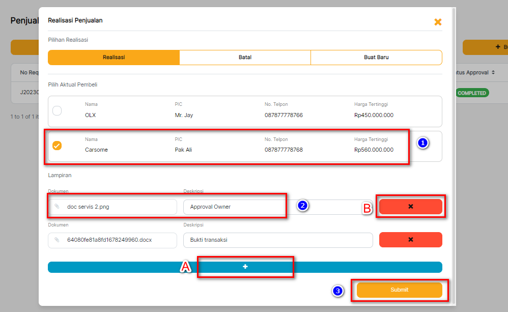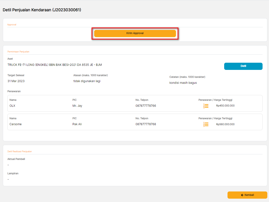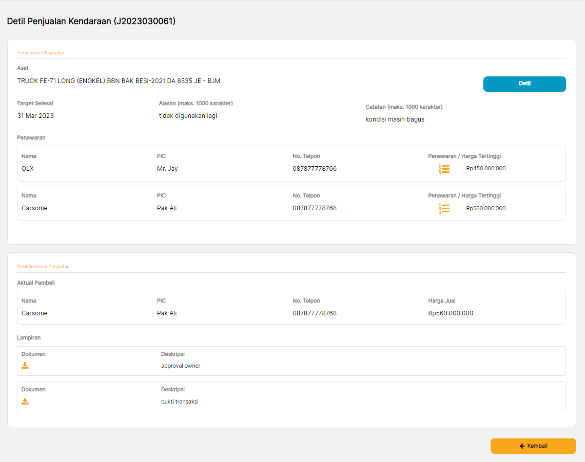 Proses realisasi selesai, kendaraan berhasil dijual.