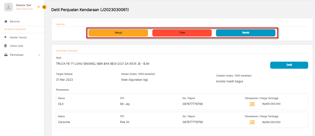 Apabila data permintaan penjualan sudah benar, general support dapat melakukan pengajuan request dengan membuka detail permintaan, lalu klik Kirim Approval