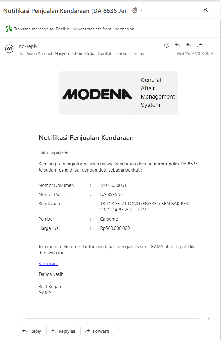 Sistem akan otomatis mengirim email ke pihak terkait berupa notifikasi kendaraan telah dijual
