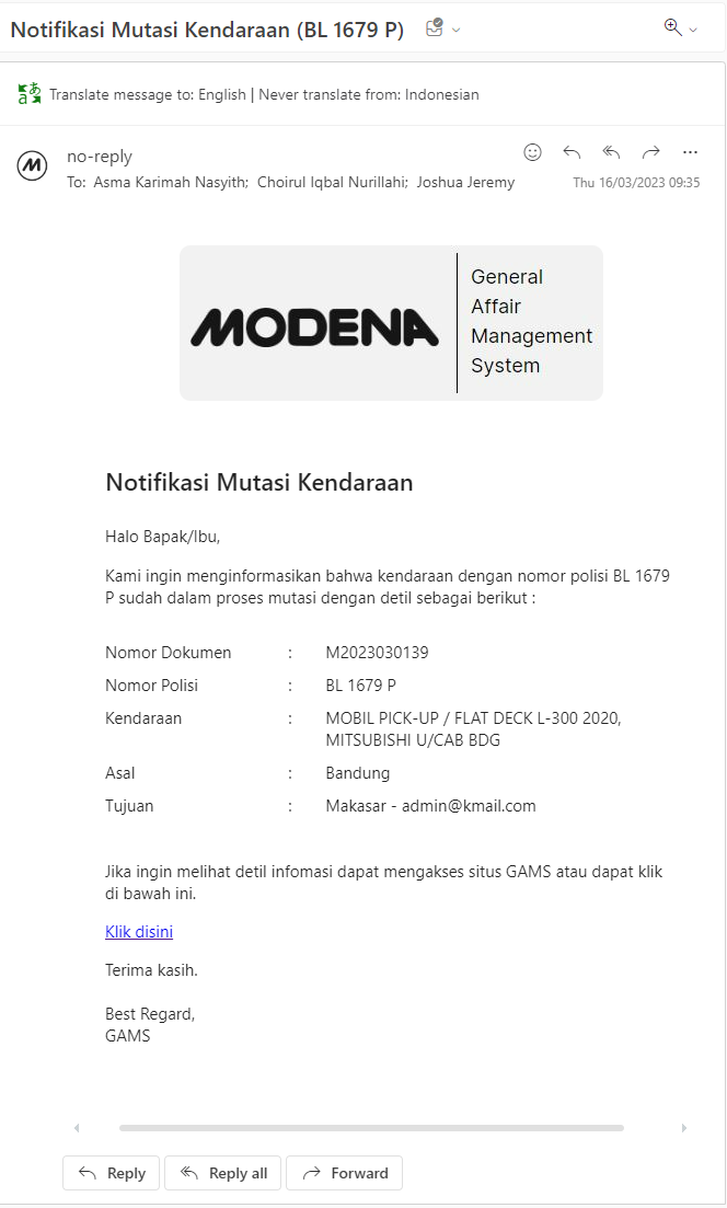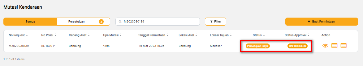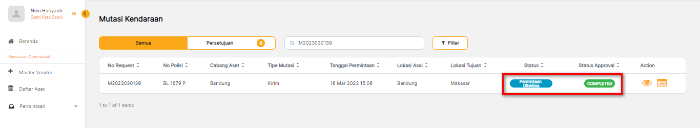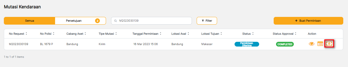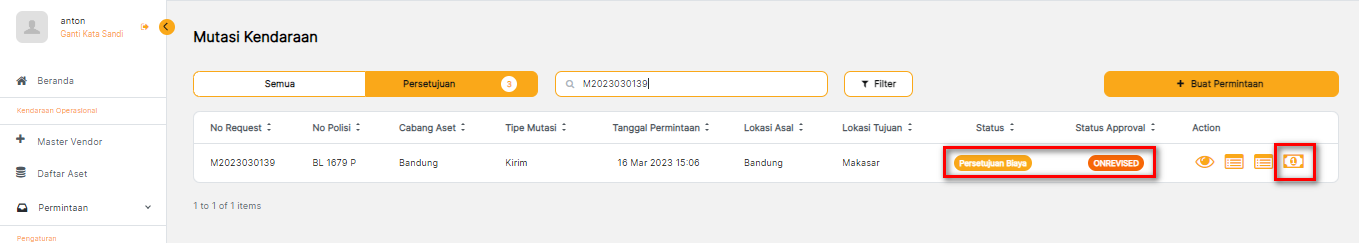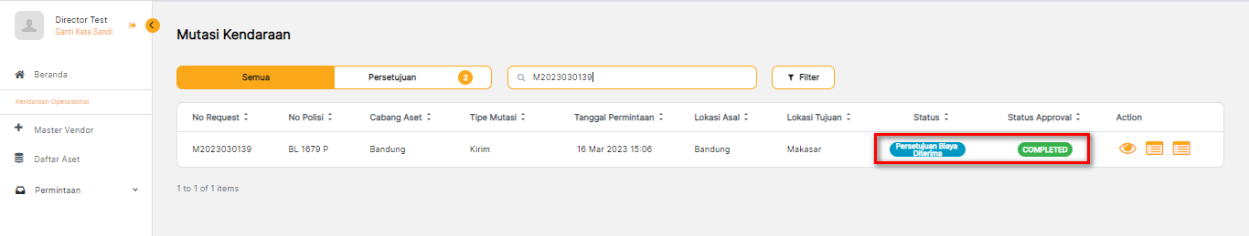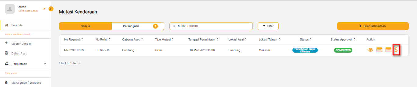 Pada Proses aproval terakhir, sistem akan otomatis mengirimkan email informasi ke cabang yang dituju atau cabang yang dimintai asetnya. Pada akun general support akan muncul ikon update biaya mutasi