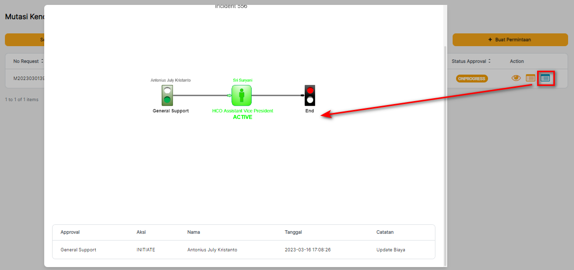 Pada saat proses submit biaya mutasi akan mengirimkan data dan request approval dari General Support ke HCO Assistant Vice President
