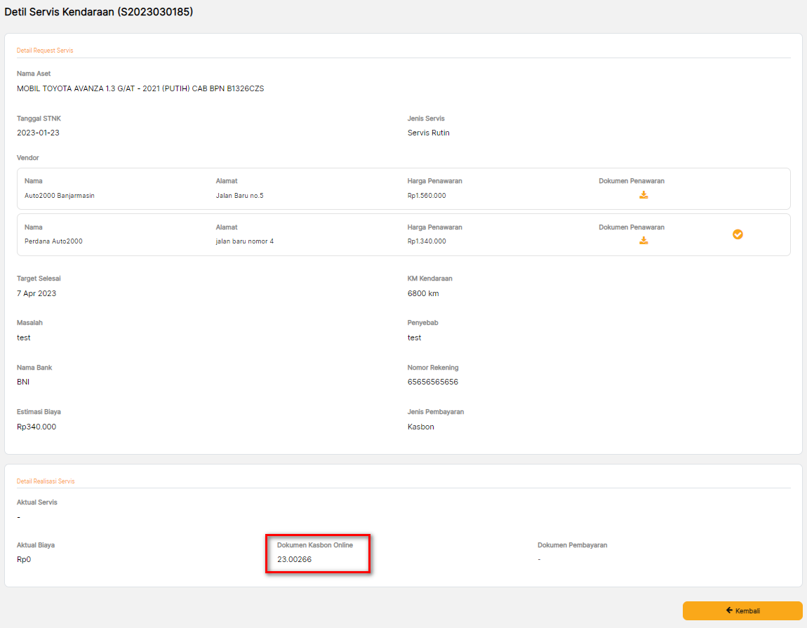 Apabila menggunakan jenis pembayaran Kasbon , maka ketika approver terakhir menyetujui Permintaan servis secara otomatis input ke sistem Kasbon Online