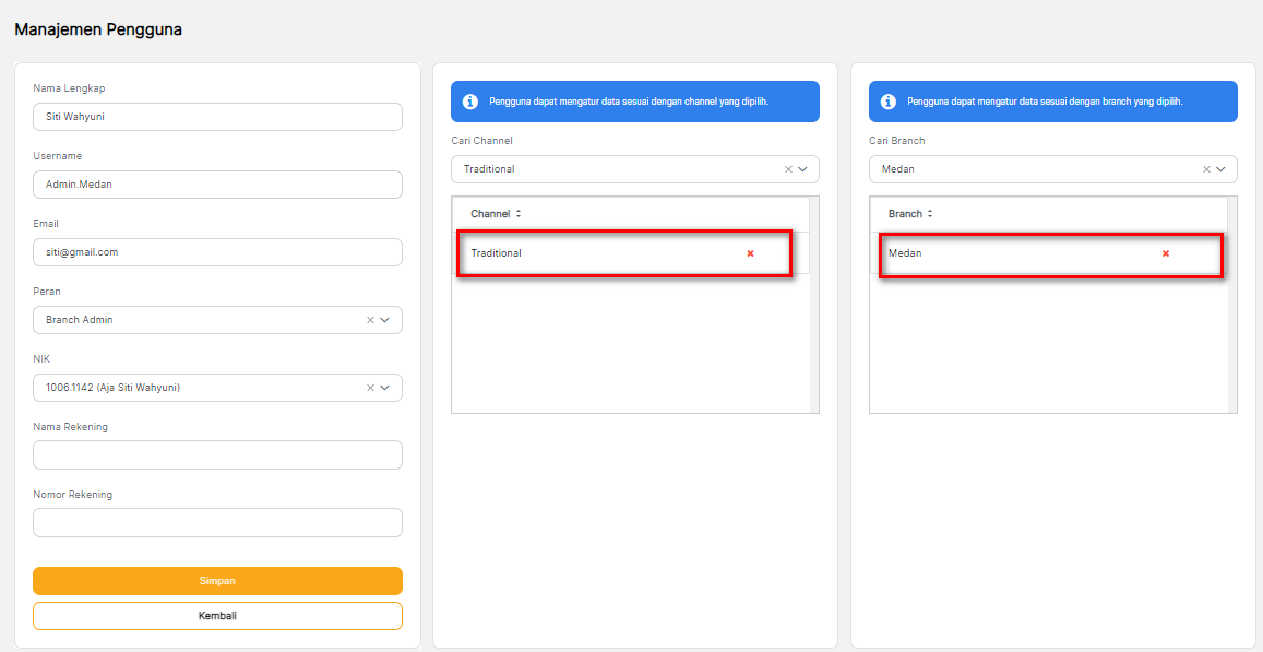 input chanel dan cabang untuk masing-masing pengguna admin cabang dan manager cabang, tidak perlu klik tombol simpan jika yang diubah data chanel dan cabang