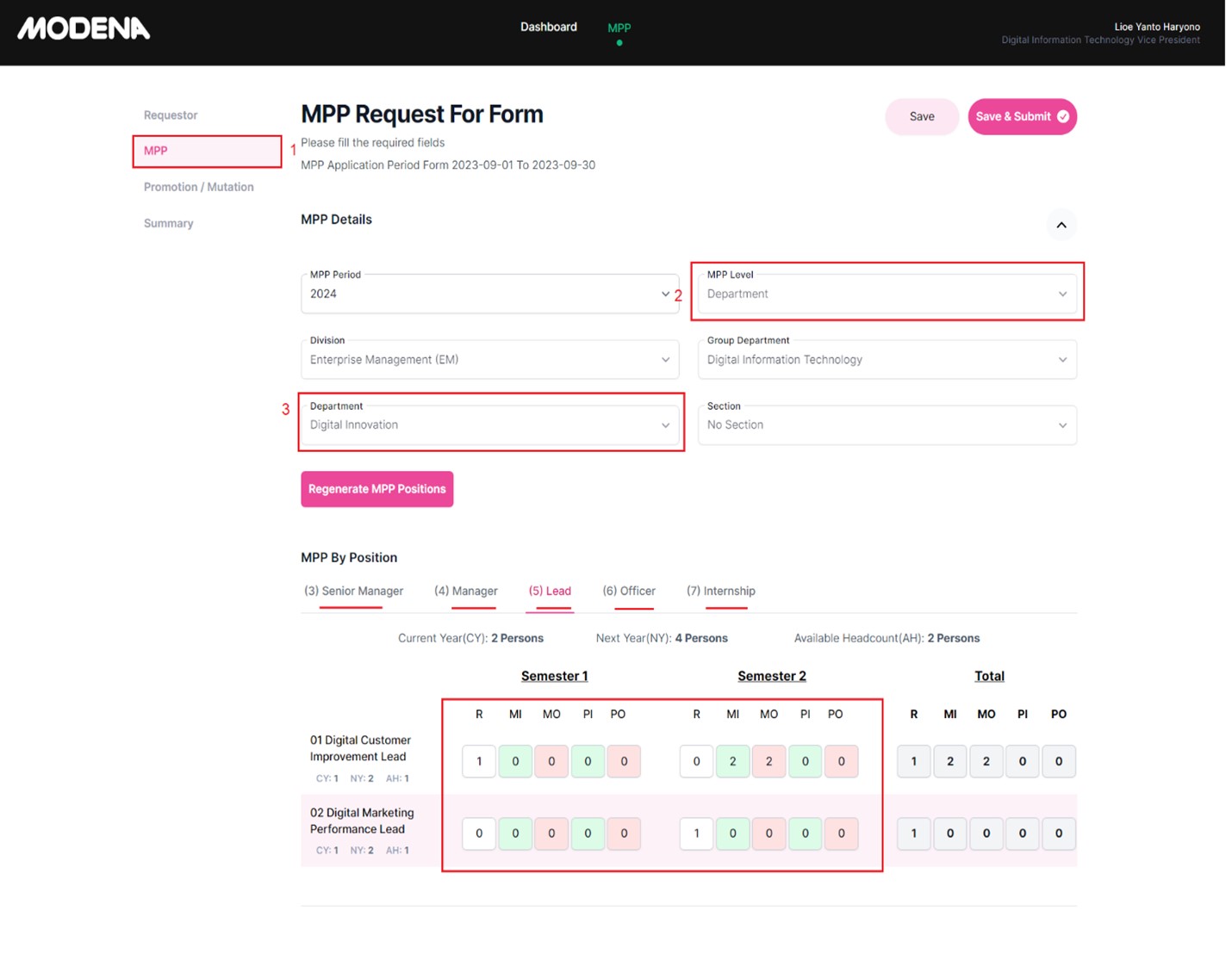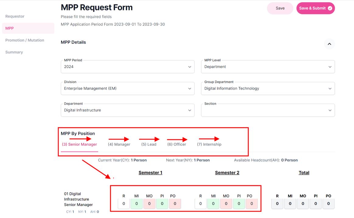 - Pada pojok kanan atas ,klik Save , untuk menyimpan data sementara, atau Klik Save & Submit, untuk proses approval selanjutnya