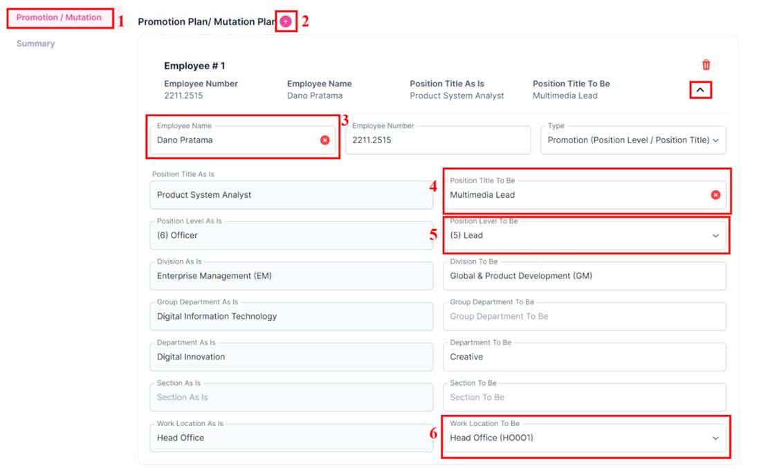 - Jika karyawan yang akan di plan promosi/mutasi lebih dari satu, silahkan lakukan pengulangan mulai dari step 5 sampai step 6
