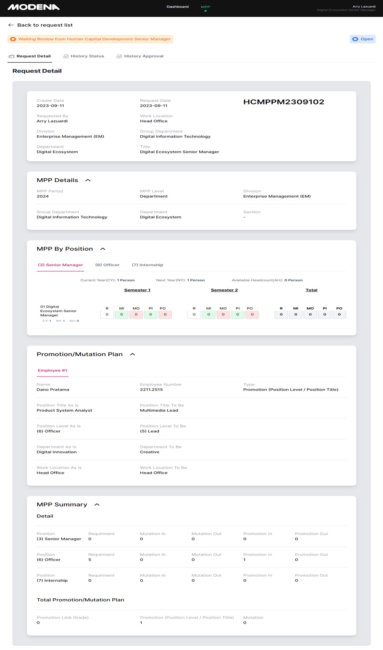- Klik Promotion / Mutation (Left Side Menu), jika akan dilakukan promosi ataupun mutasi, sesuai dengan MPP request yang sudah diSubmit