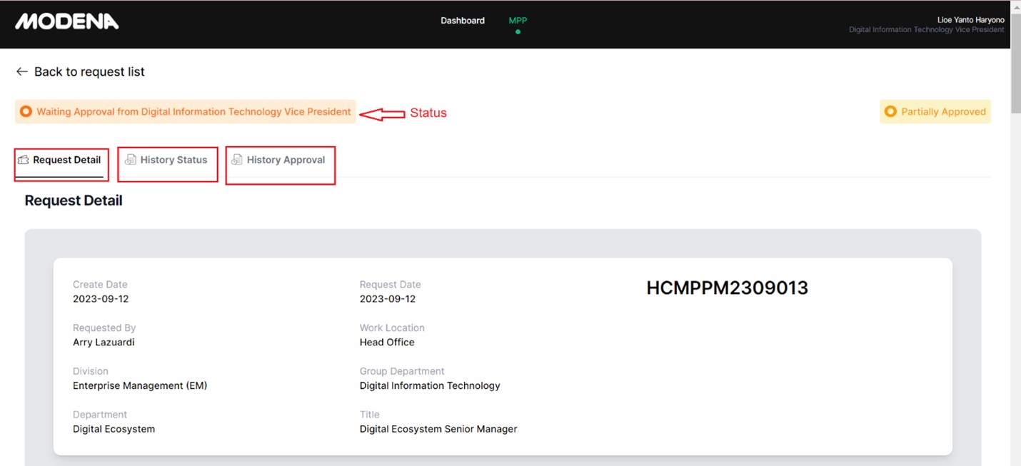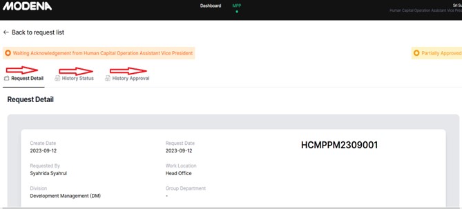 - Pada halaman approval terdapat 3 tab, Submit Detail, History Status, History Approval