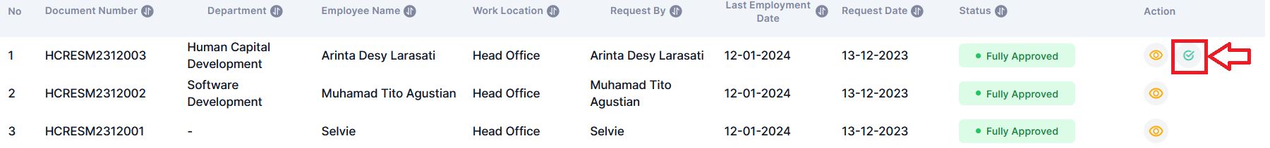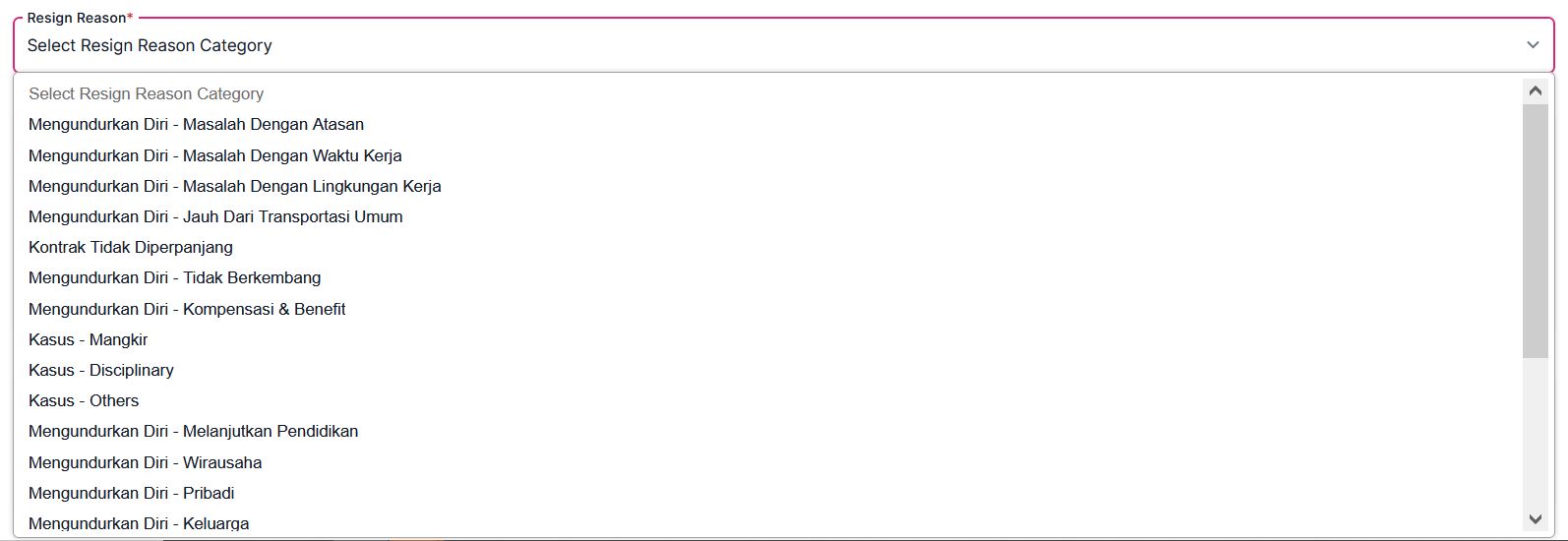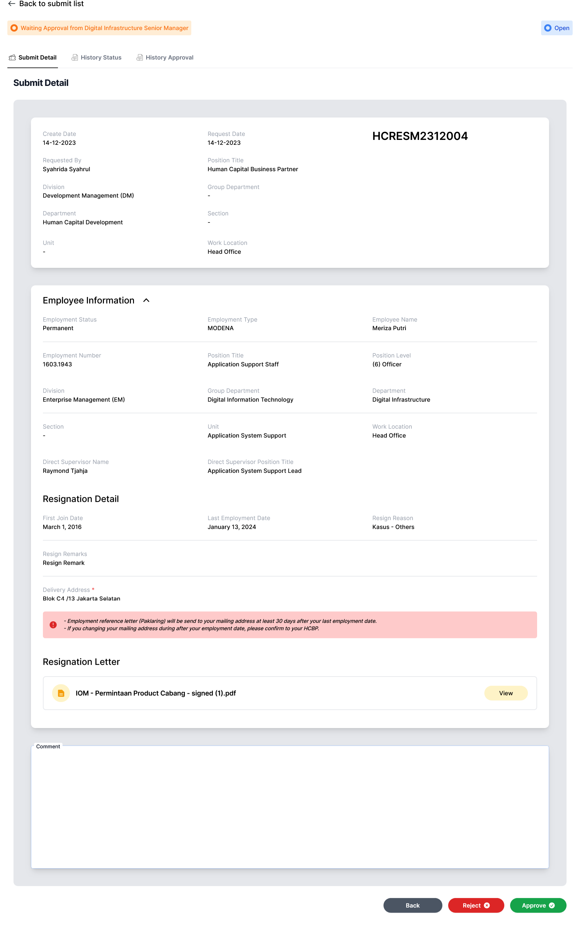 Reject ==> pengajuan Resign ditolak, dan proses approval terhenti