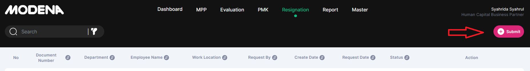 - Klik Menu Dashboard.Pada menu ini kita bisa melihat pengajuan yang pernah diinput baik itu MPP, Evaluation, PMK, Resgination ataupun Report (khusus admin).
